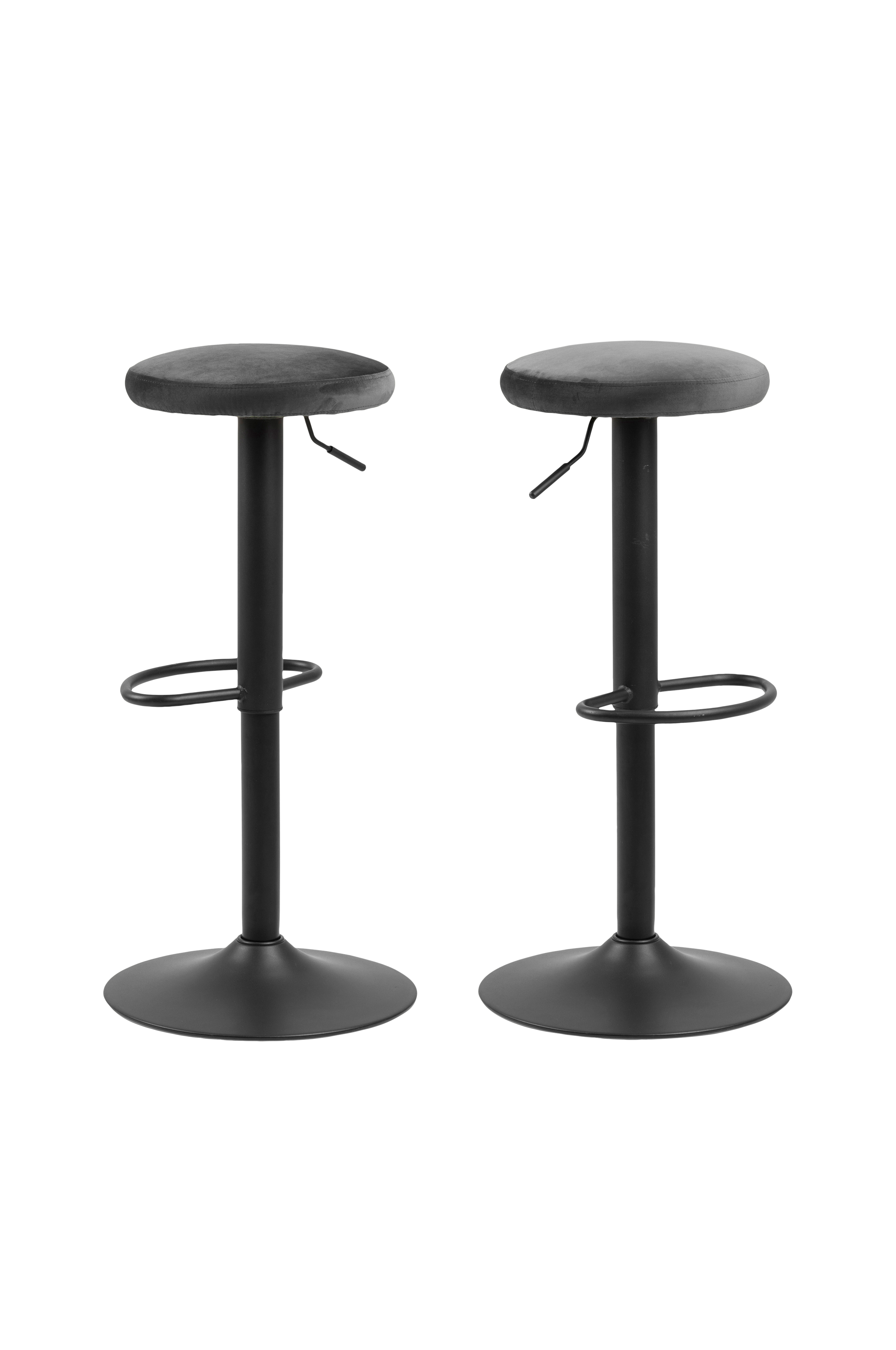 Barstol med trompetfot av metall med fotstøtte. Rundt sete kledd med fløyelsstoff. Mål: Regulerbar høyde 62-82 cm, diameter 40 cm. Montér selv.