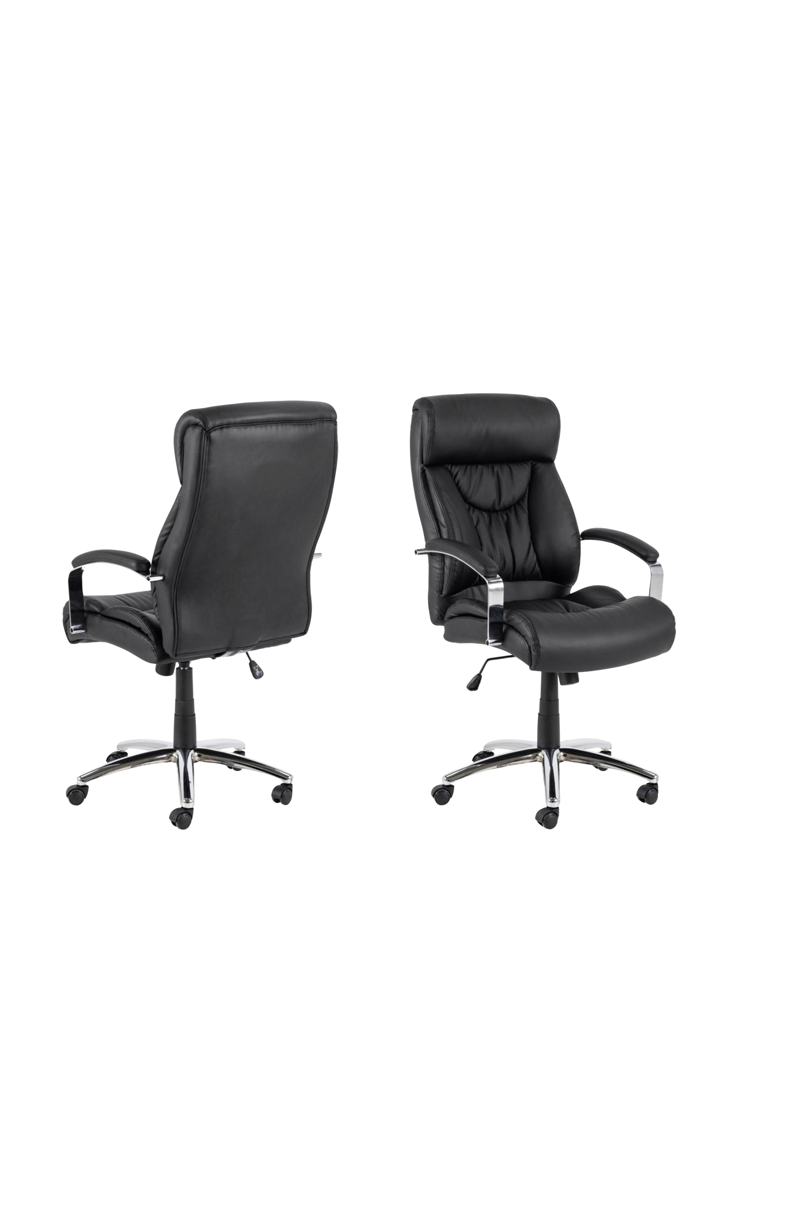 Med denne skrivebordsstolen i kunstskinn er det ikke noe problem å jobbe komfortabelt. Den har et mykt polstret ryggstøtte, armlener og et dreibart understell med hjul for enklere forflytning. Bremsehjulene hindrer dessuten stolen i å bevege seg når den ikke belastes med vekt. For å oppnå optimal sittekomfort kan stolen justeres med vippeknappen og gassløftemekanismen.