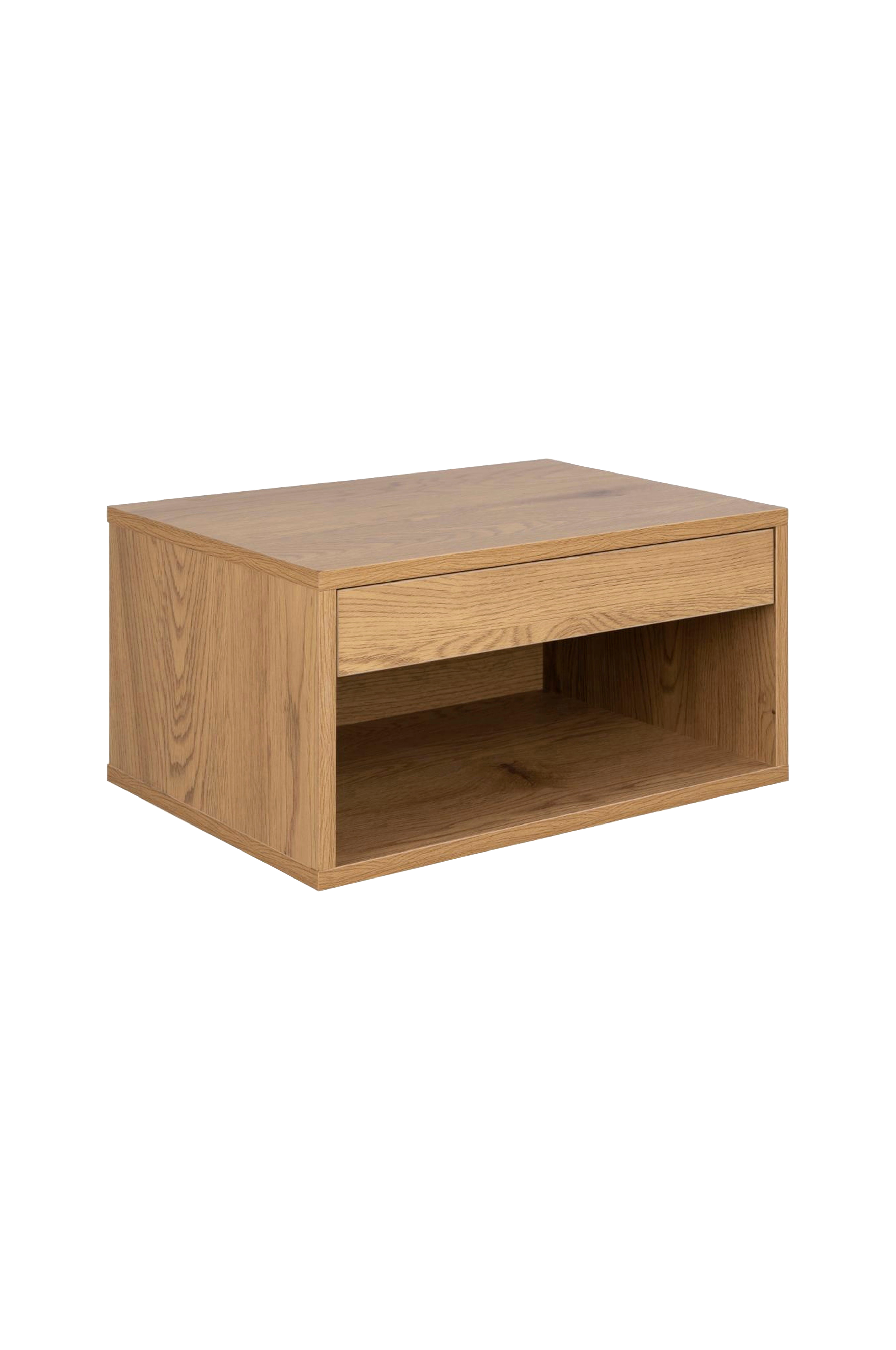 Et praktisk, men likevel attraktivt veggmontert nattbord i vill eik, som passer sømløst inn i den moderne soveromsinnredningen. Den glidende skuffen er perfekt for oppbevaring av de viktigste tingene på sengen, mens det åpne rommet er ideelt for bøker eller magasiner.