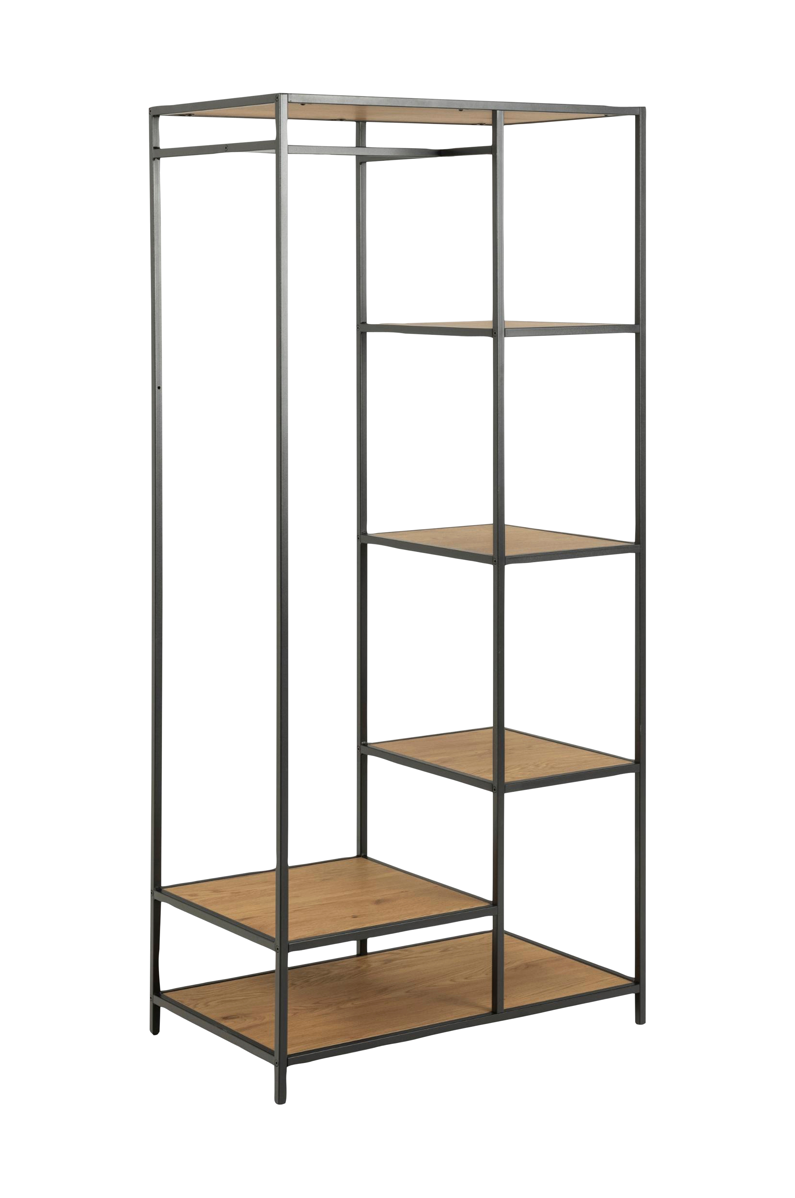 Garderoben er produsert av nøye utvalgte materialer som er lettstelte. Med eksklusive designrettigheter er denne garderoben den perfekte detaljen som gir rommet en pen stil. Møbelet har en slående treeffekt og pulverlakkert metallstamme, og kan kombineres med mange ulike interiørstiler. Plater av foliert MDF.