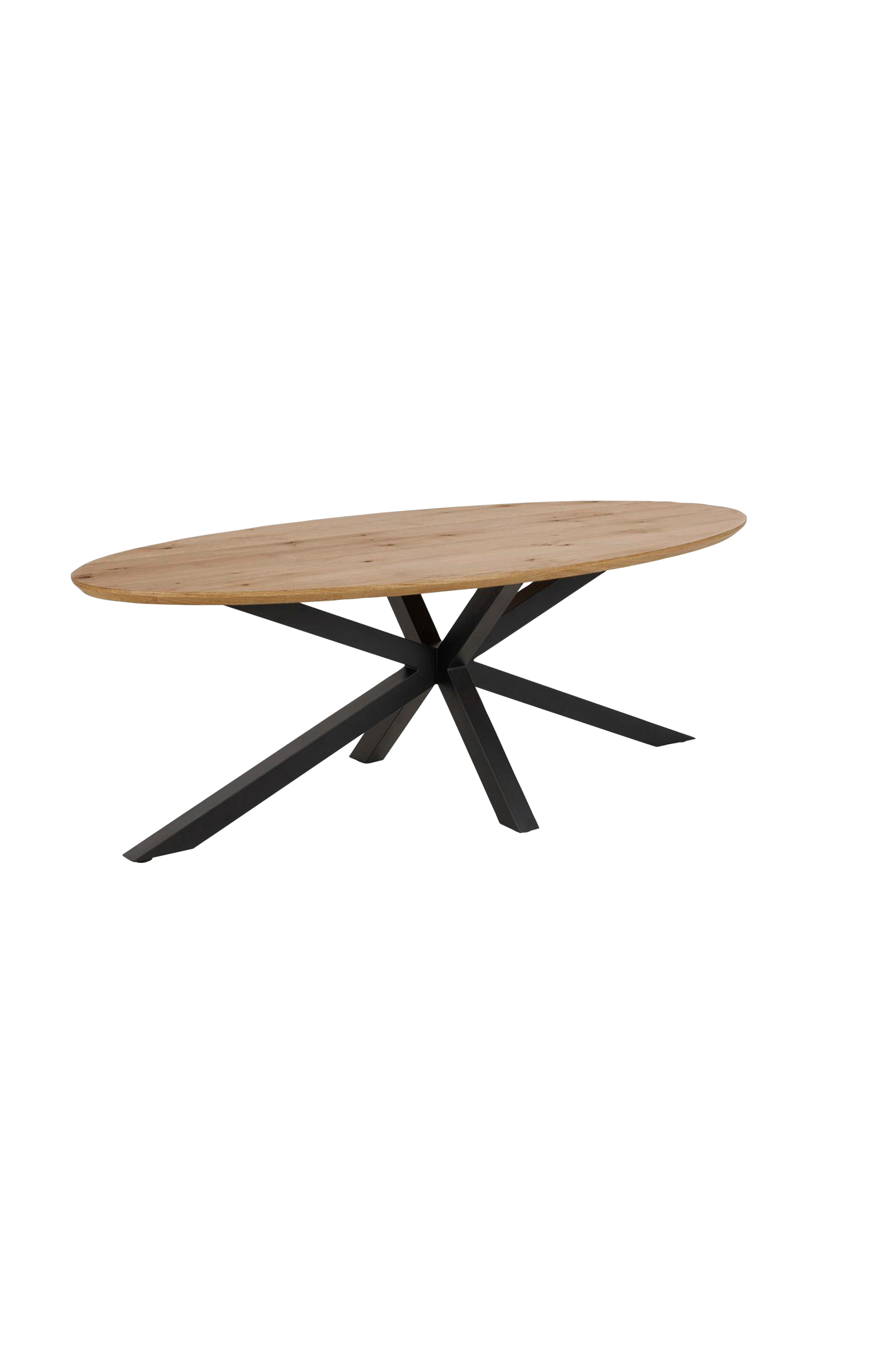 Med en oval bordplate og et skulpturelt understell vil dette spisebordet vekke oppsikt i enhver spisestue. Bordplaten i eikefiner har en organisk form som gjør at bordet ser innbydende ut. Det tverrstilte stålunderstellet tiltrekker seg ikke bare oppmerksomhet, det balanserer også bordplaten.