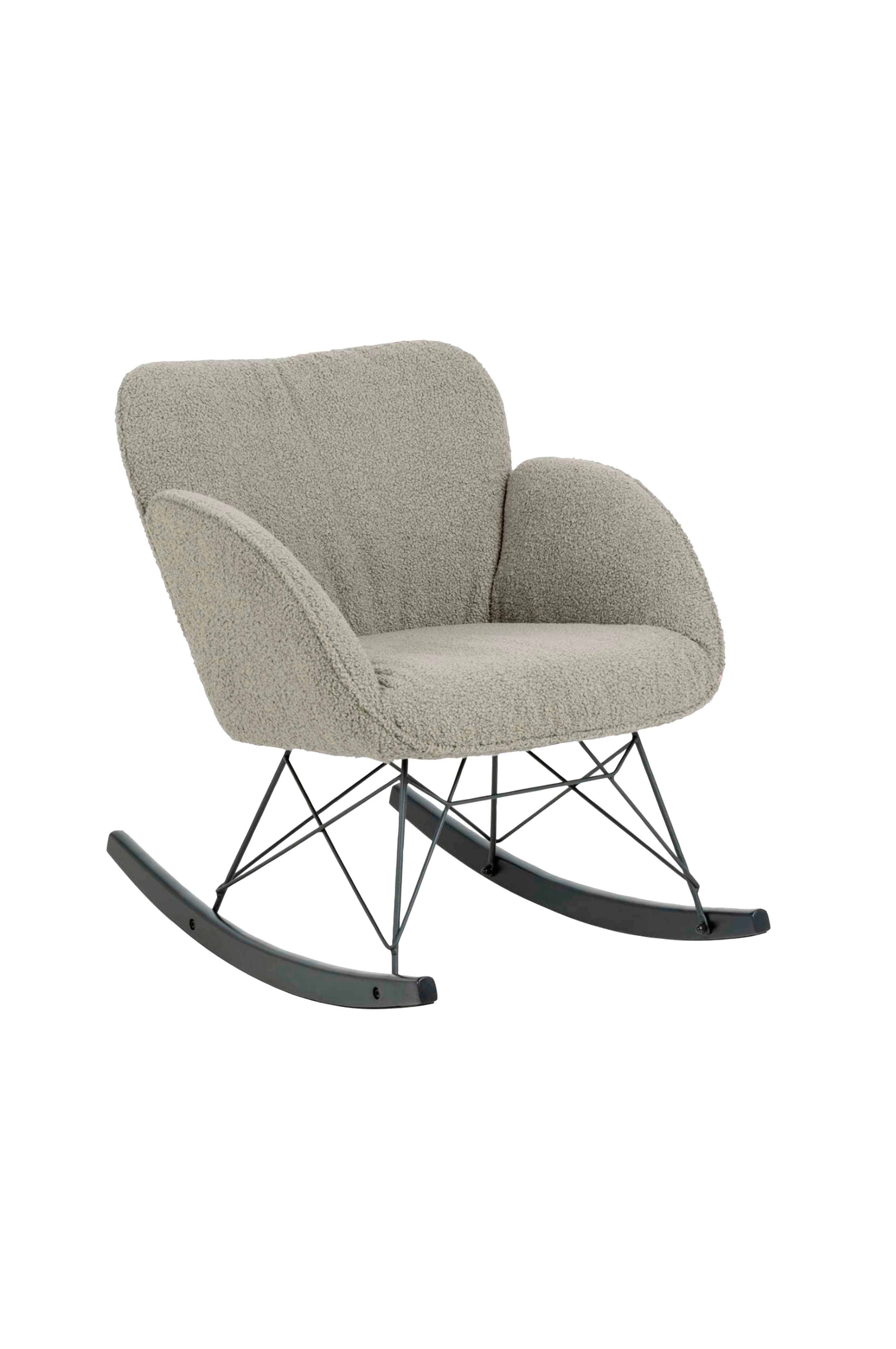 Det er så mye å si om denne vakre gyngestolen. Fra komfort til stil, denne stolen har alt. Stolen er trukket med et veldig mykt gråbrunt teddy-lignende stoff og har en innbydende følelse. Legg merke til snittet mellom armlenet og ryggstøtten og det løse stoffet som gir en veldig moderne følelse. Du kan enkelt gynge på de svartlakkerte bøkebenene med pulverlakkert forbindelse.