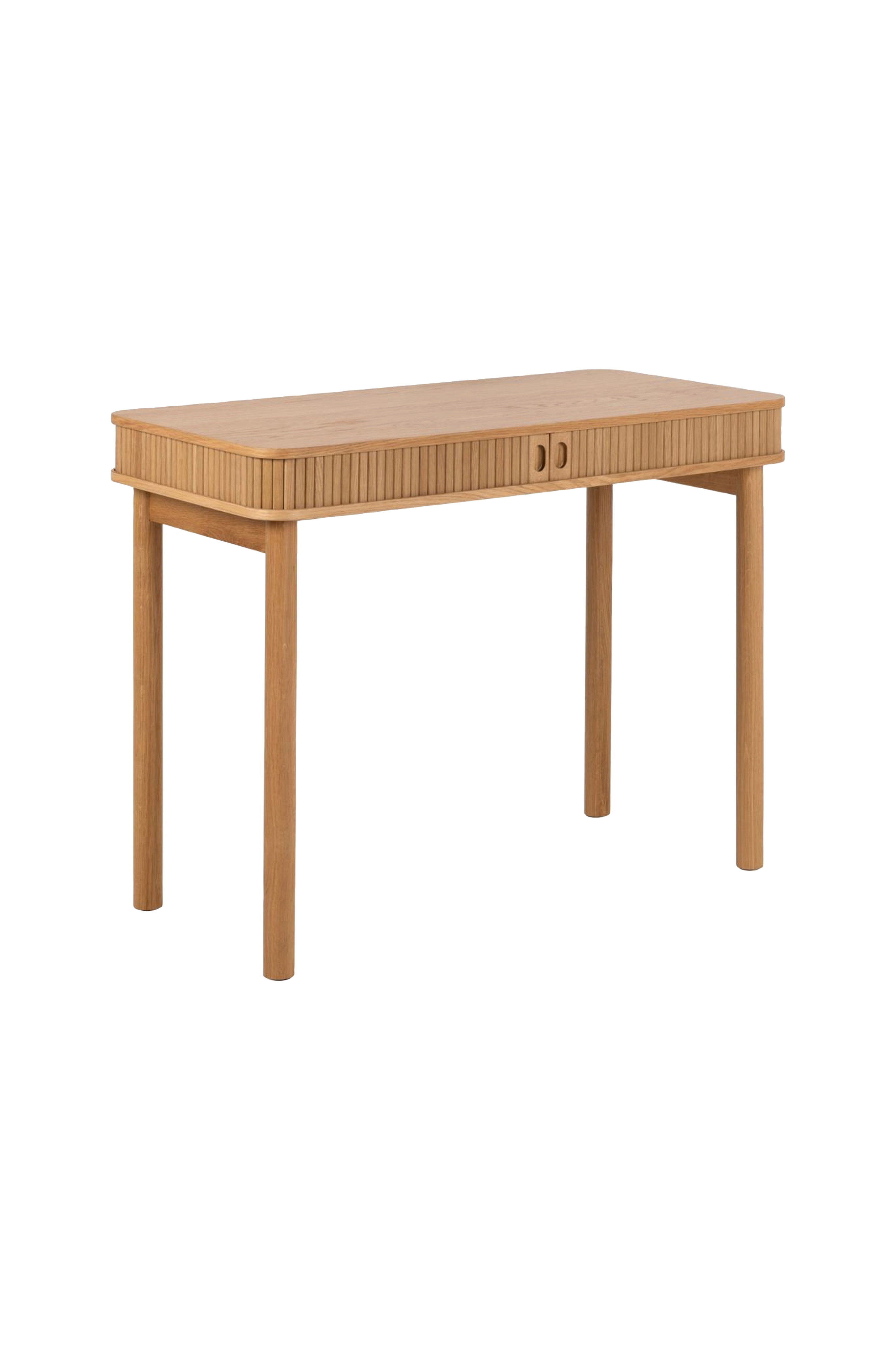 Løft hjemmekontoret ditt med dette skrivebordet i tre. Skrivebordet har en rektangulær form med runde hjørner og kombinerer moderne og naturlig estetikk som passer til ulike interiørstiler. Det er spaltedekoren, den runde karakteren og de lakkerte eikeacentene som definerer skrivebordets signaturutseende. Du kan også oppbevare de viktigste tingene dine på innsiden av skrivebordet, bak jalusidøren.