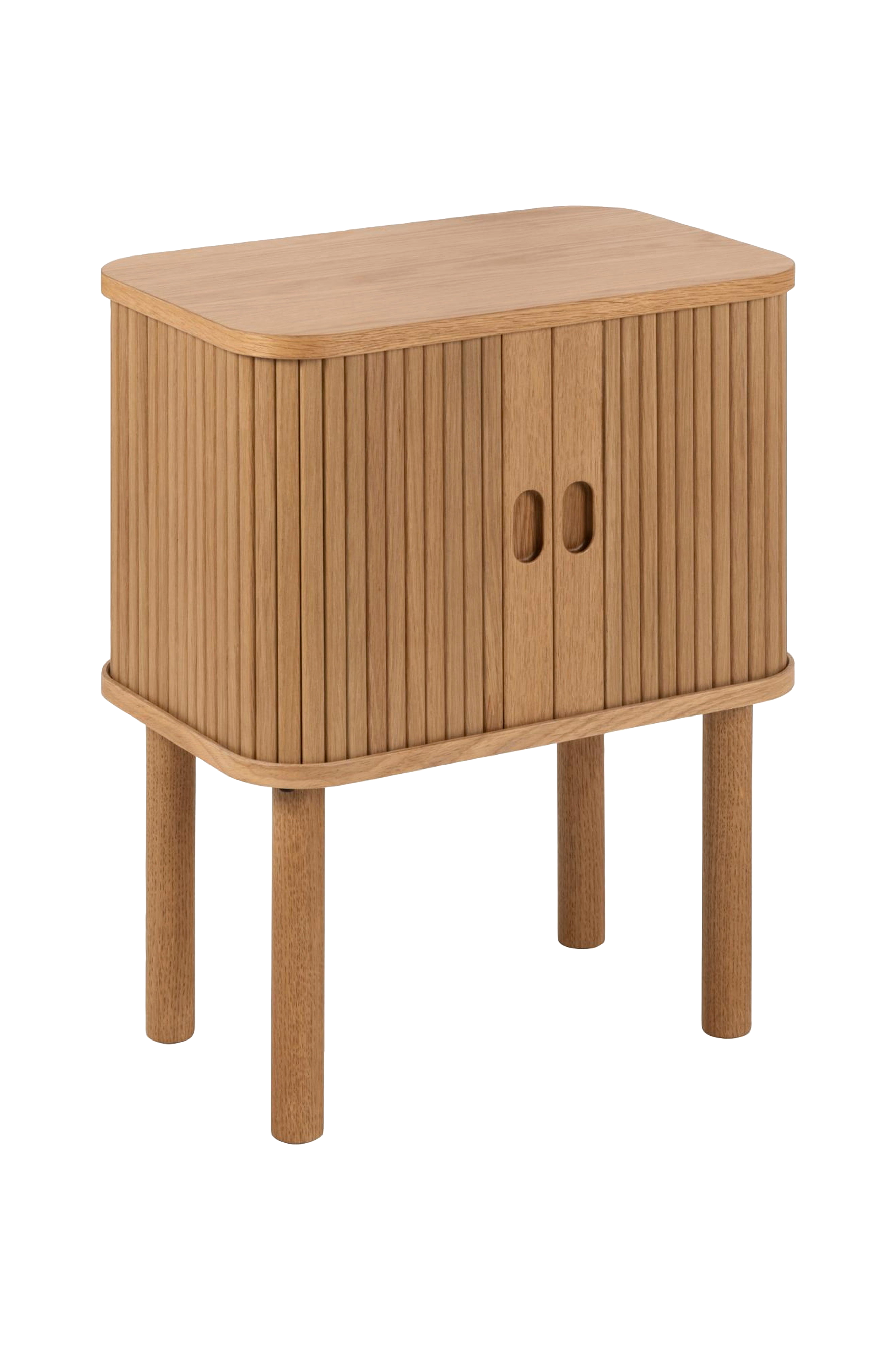 Dette nattbordet i tre løfter soverommet ditt. Bordet har en rektangulær form med runde hjørner og kombinerer moderne og naturlig estetikk som passer til ulike interiørstiler. Det er spaltedekoren, den runde karakteren og de lakkerte eikeacentene som definerer bordets signaturutseende.