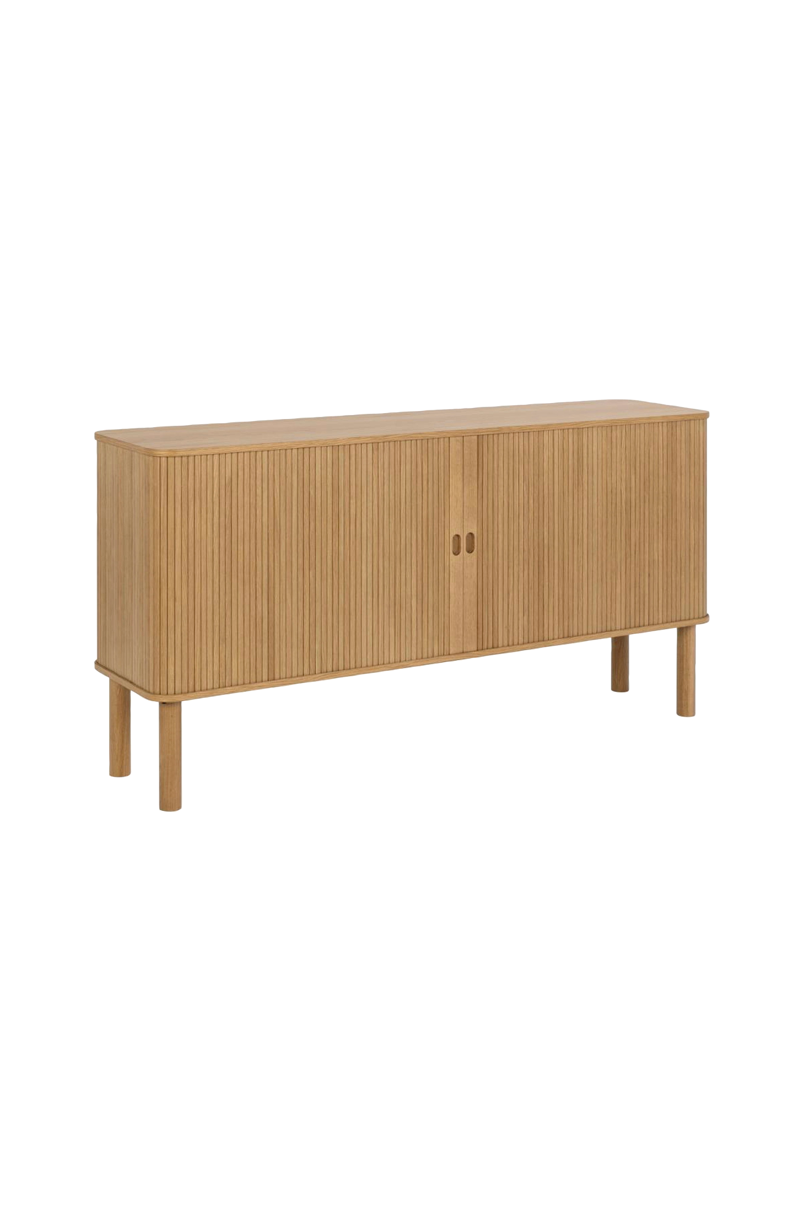 Løft hjemmet ditt med denne skjenken i tre. Oppbevaringsenheten er utformet i en rektangulær form med runde hjørner og kombinerer moderne og naturlig estetikk som passer til ulike interiørstiler. Det er spaltedekoren, den runde karakteren og de lakkerte eikeacentene som definerer skjenkens signaturutseende. Inne i skjenken finner du to justerbare hyller som gir praktisk oppbevaring.