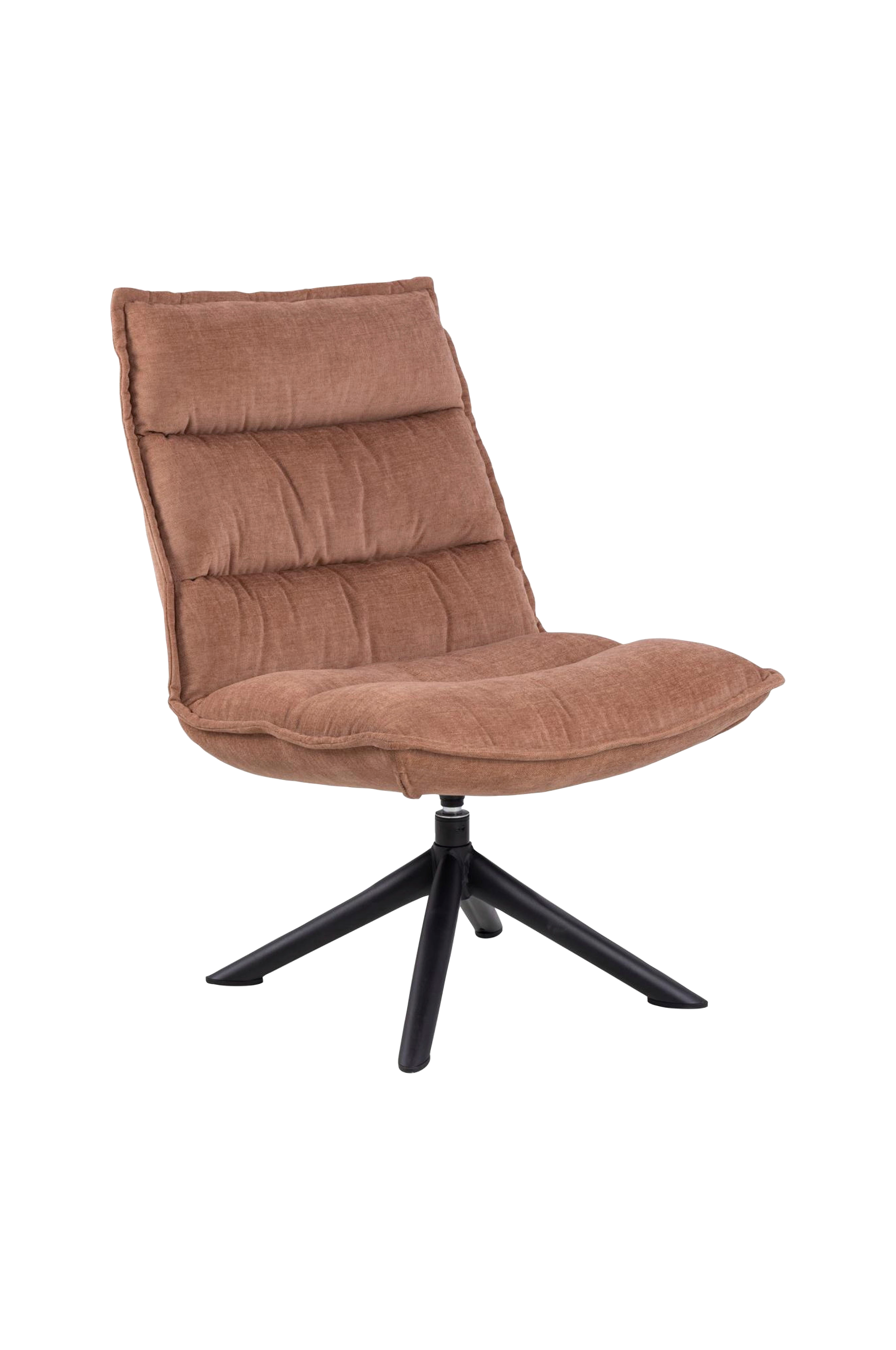 Denne lenestolen er en blanding av 80-tallsmøbler, moderne designestetikk og dristige detaljer. Loungestolen har et moderne uttrykk og en retrokarakter, og er trukket i et mykt stoff med chenilleeffekt i rosentrefarge som skaper ro. De horisontale sømmene gir stolen et flatterende, fyldig utseende. Den har også en svingfunksjon som gir en moderne følelse.
