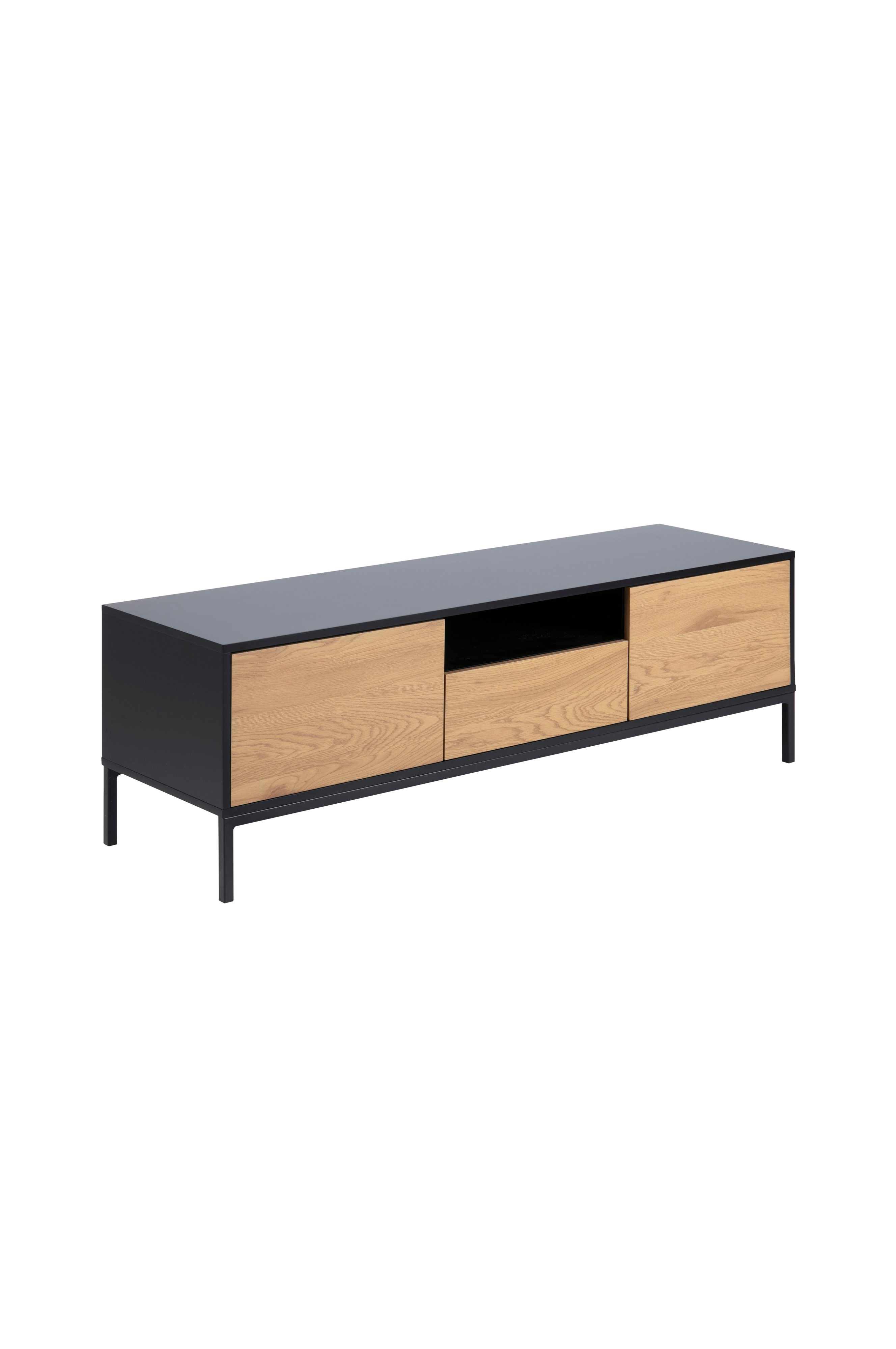 Flott mediabenk med både skuffer og 2 dører i matt svart vill-eik.