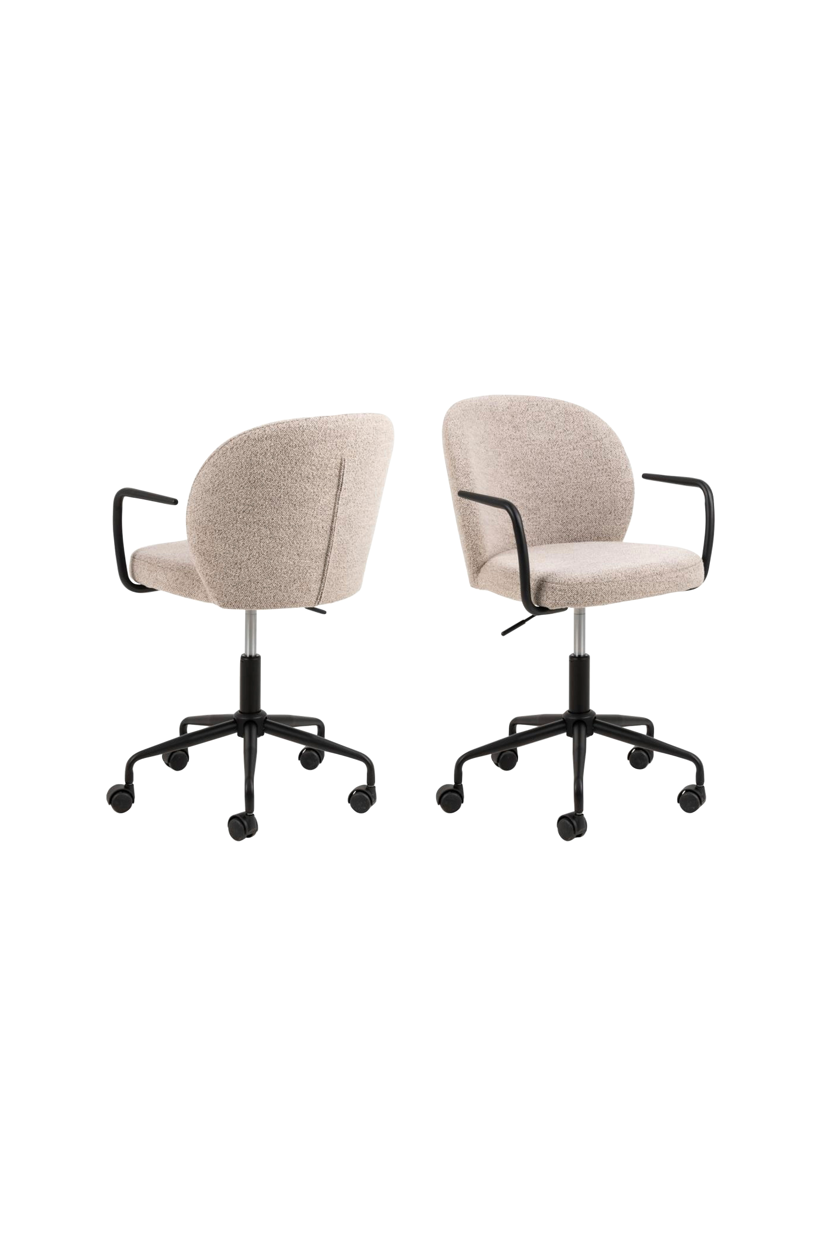 Denne skrivebordsstolen har et sofistikert utseende med avrundet rygg, rørformede armlener og et mykt, bouclé-lignende møbeltrekk. Stolen har et femstjerners svingbart understell med myke bremsehjul og gassløft, noe som gir smidig bevegelse og enkel høydejustering. Den er designet for å løfte hjemmearbeidsplassen din.