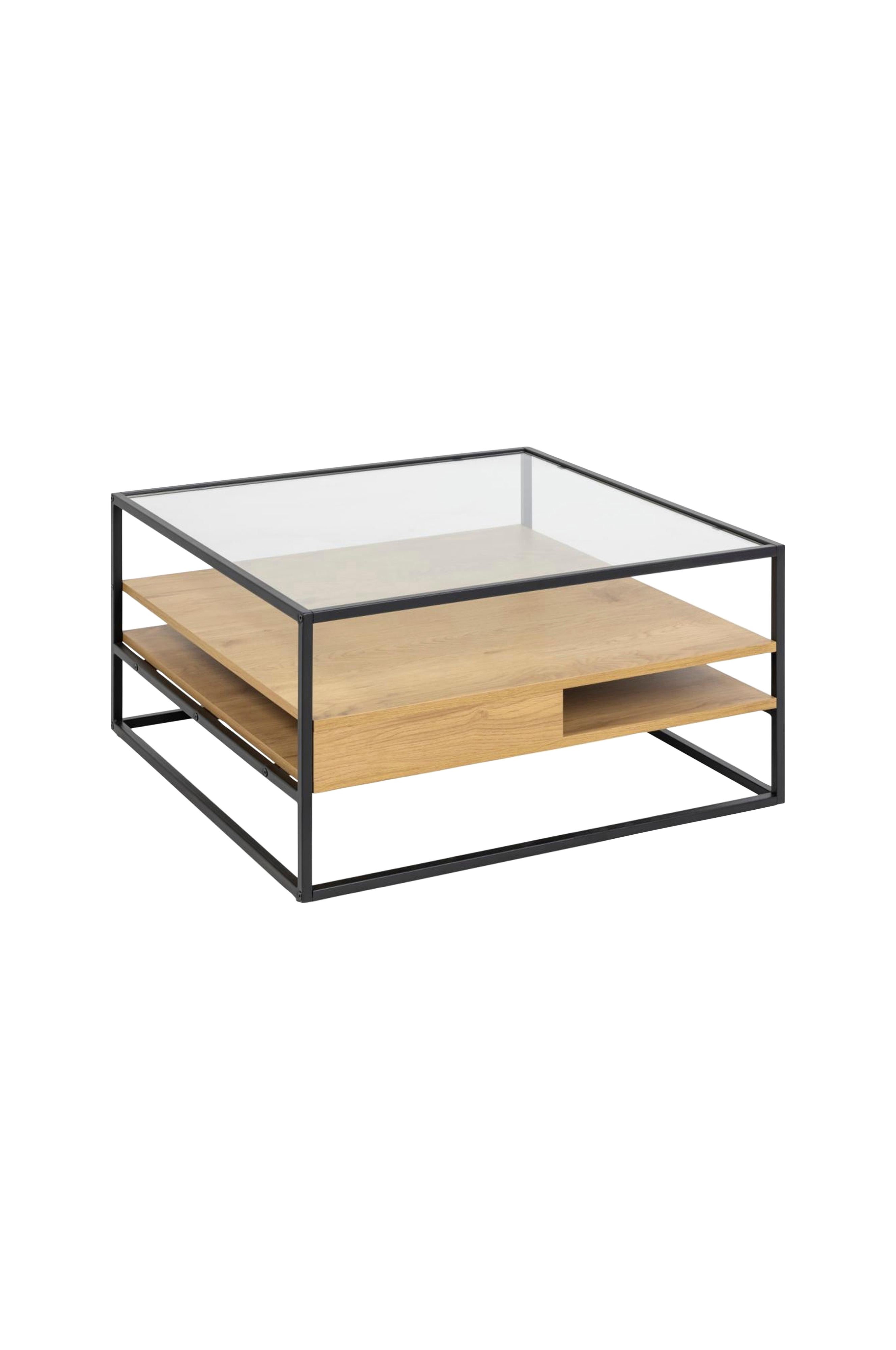 Med et karakteristisk kubisk metallunderstell vil dette sofabordet passe perfekt inn i ethvert moderne hjem. Den klare glassplaten gir det et lett uttrykk. Bordet har to hyller i en vill eikelook som gir stilfull oppbevaring. Nyt den moderne stemningen mens du nipper til kaffe - eller te om du foretrekker det.