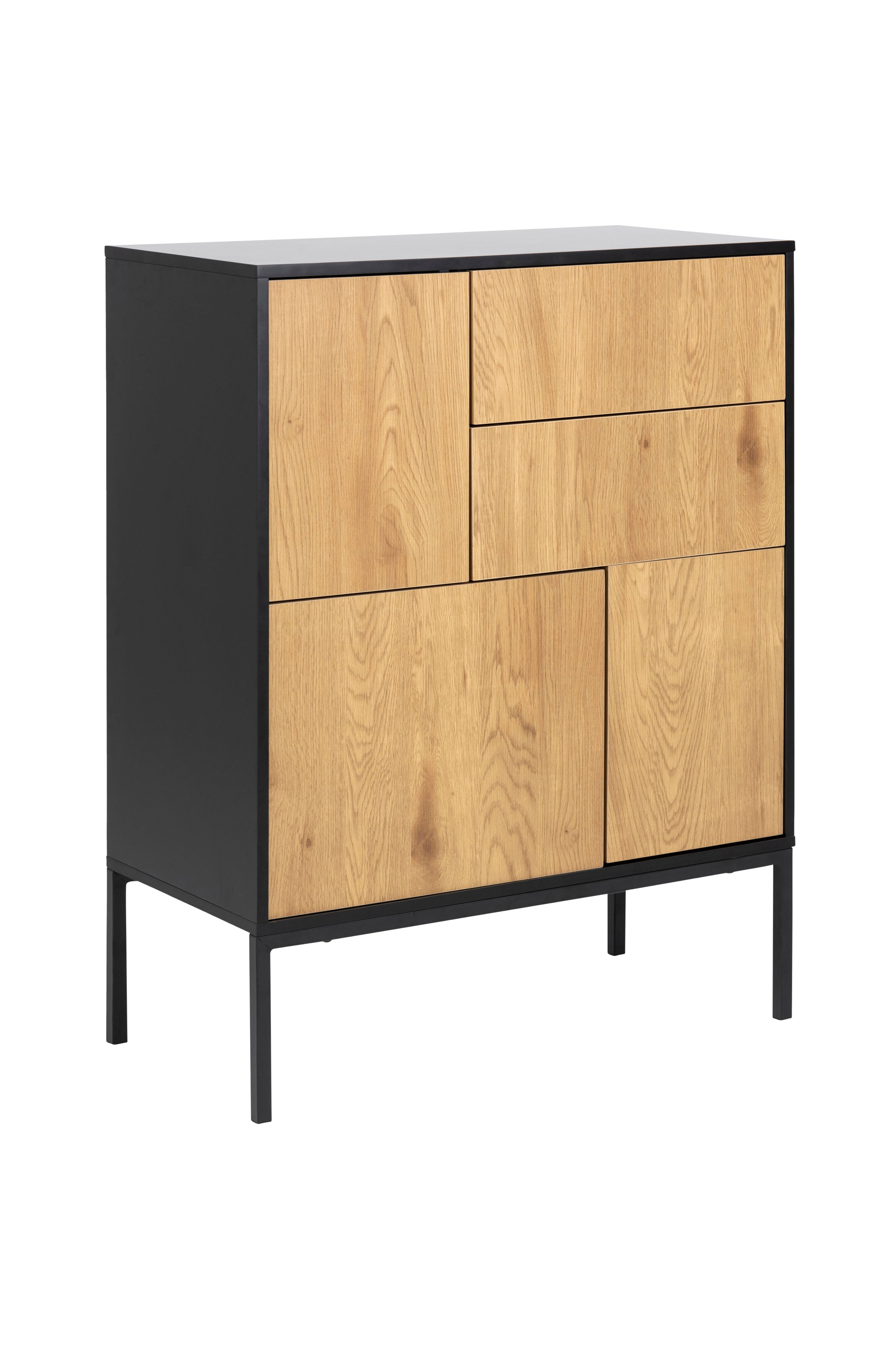 Skap Agust. MDF-stamme og finerte dører og skuffer, med metallstamme. Mål: Bredde 80, dybde 40, høyde 103 cm. Montér selv.