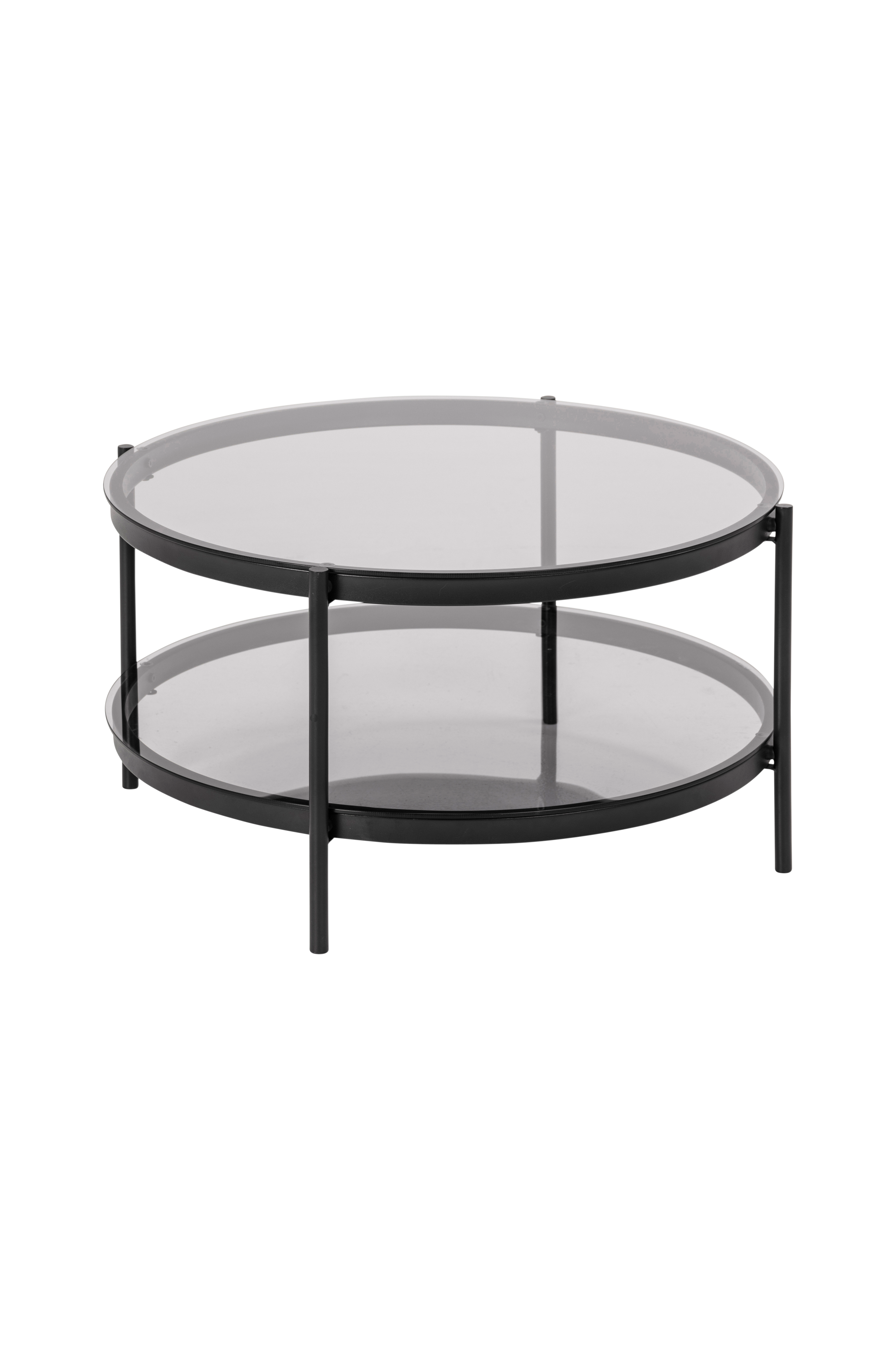 Sofabord med røykfarget glassplate, 6 mm. Stamme av pulverlakkert matt metall. Mål: Diameter 75, høyde 42 cm. Leveres umontert.