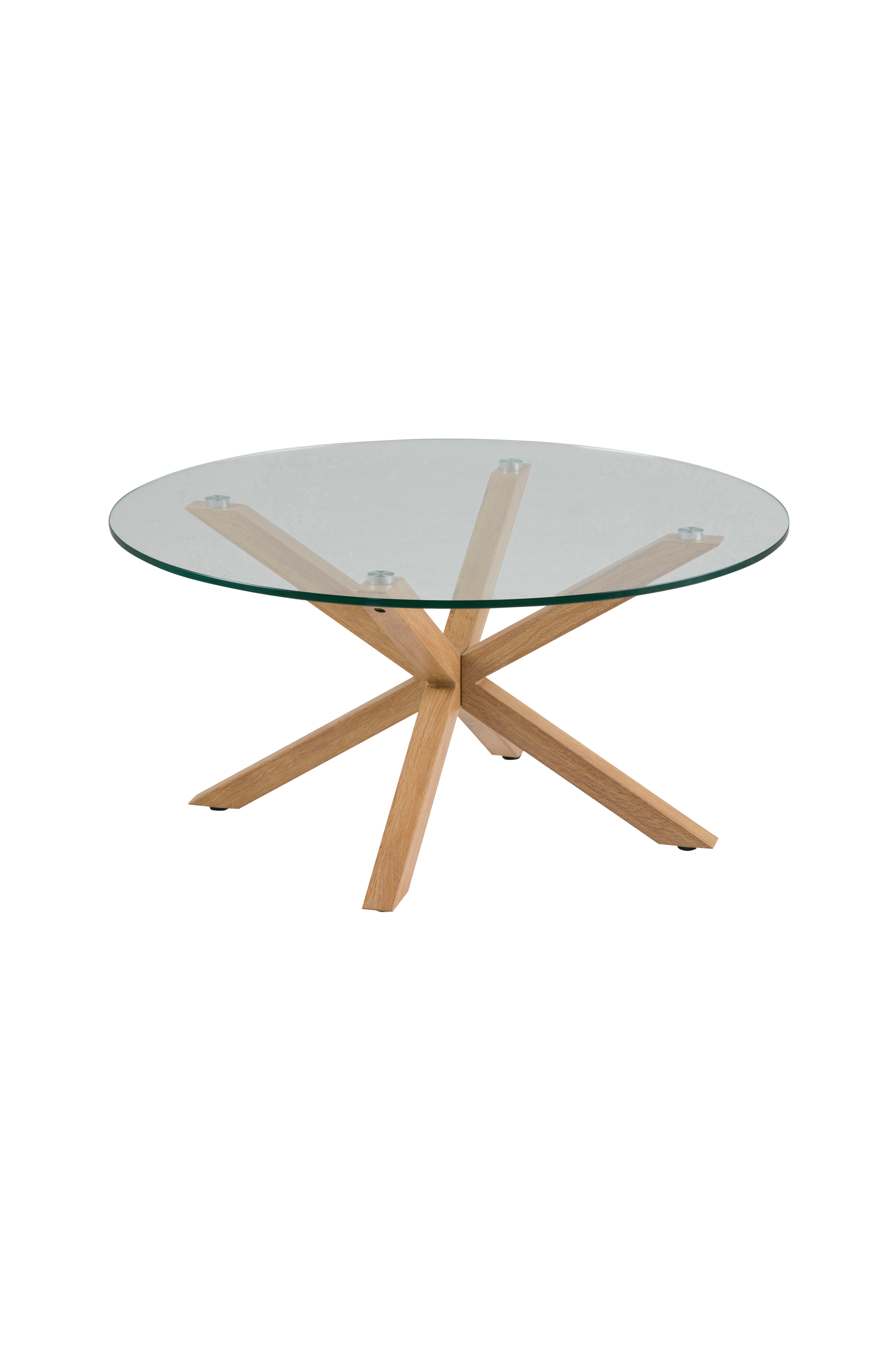 Sofabord Milou, bordplate av 10 mm klart glass. Ben av metall kledd med eikefolie. Mål: 82 x 82 cm, høyde 40 cm. Leveres umontert.