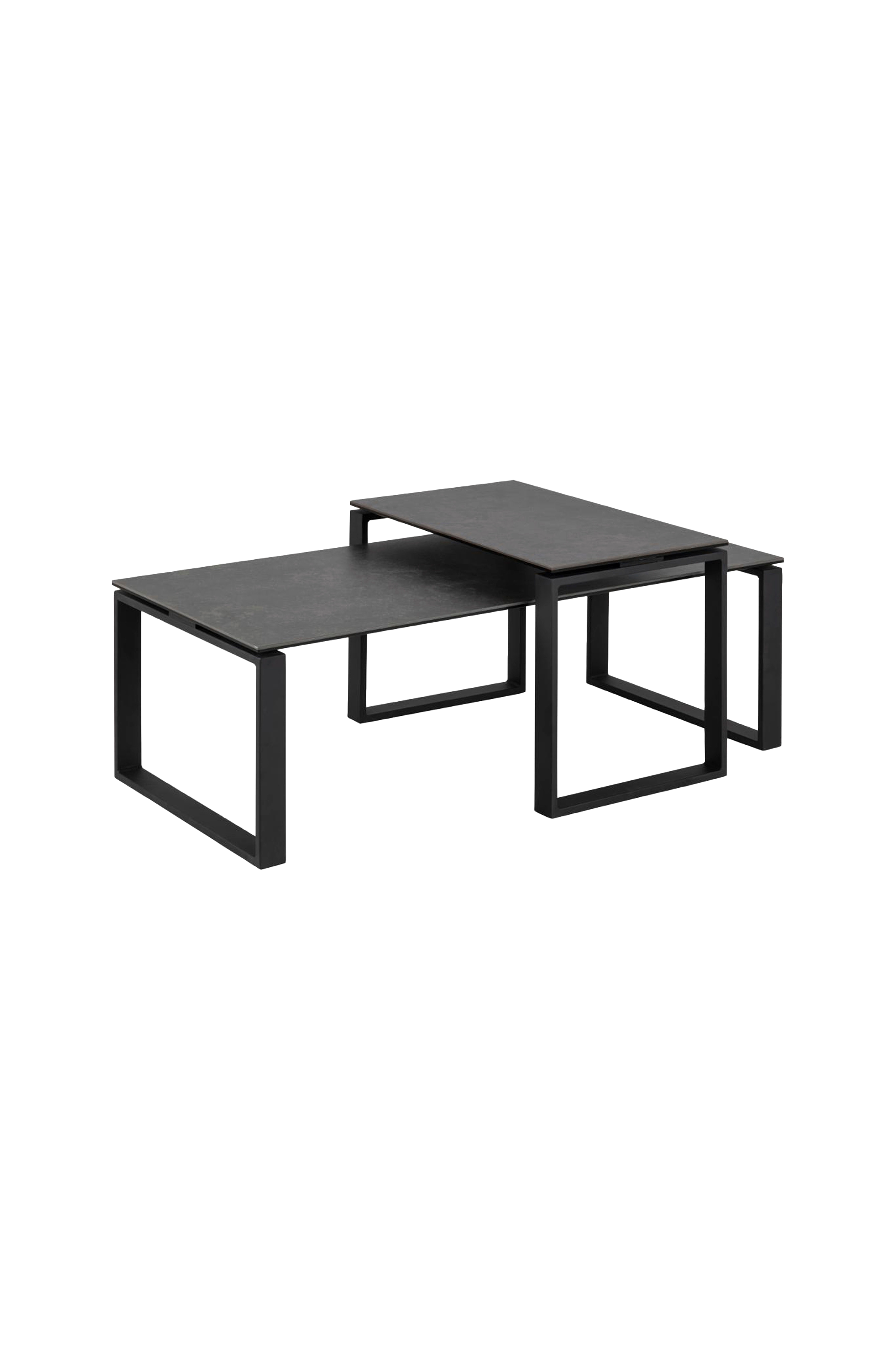 Sett med sofabord av metall og keramikk som passer perfekt i et moderne hjem. Kombinasjonen av keramisk bordplate og pulverlakkert stamme gir bordet et stilrent, trendy utseende. Bordplaten er ikke bare pen, keramikk er også et veldig praktisk materiale som er varme- og ripebestandig. Du kan bruke bordene sammen eller fra hverandre - med dette settet blir det aldri feil. Mål: Stort bord: 55x115, 37,5 cm. Lite bord: 40x69, 45 cm. Delvis montert.