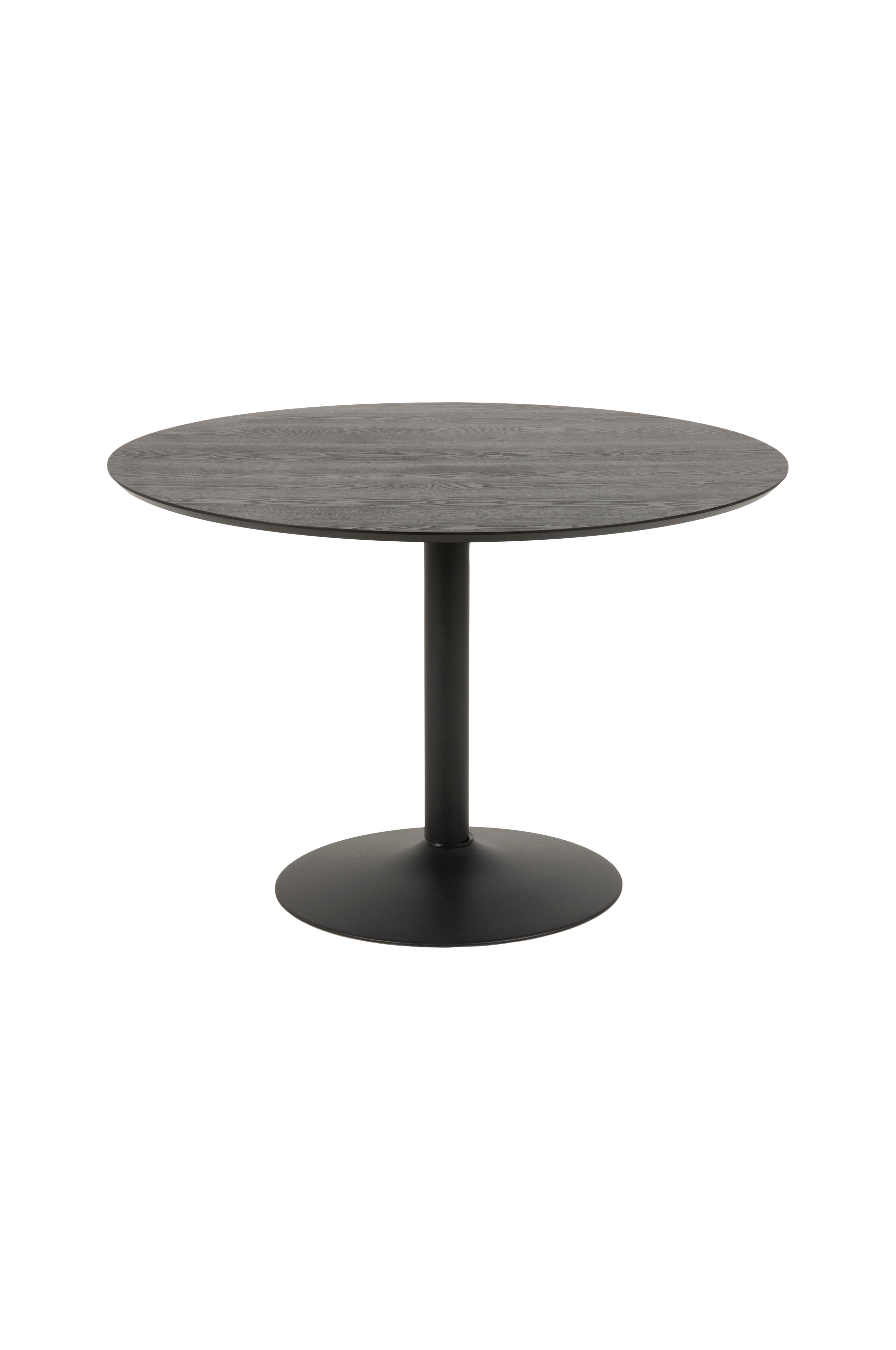 Matbord Adina askfanerad MDF topp. Med svartlackad trumpetfot. Diameter 110 cm , höjd 74 cm. Levereras omonterad.