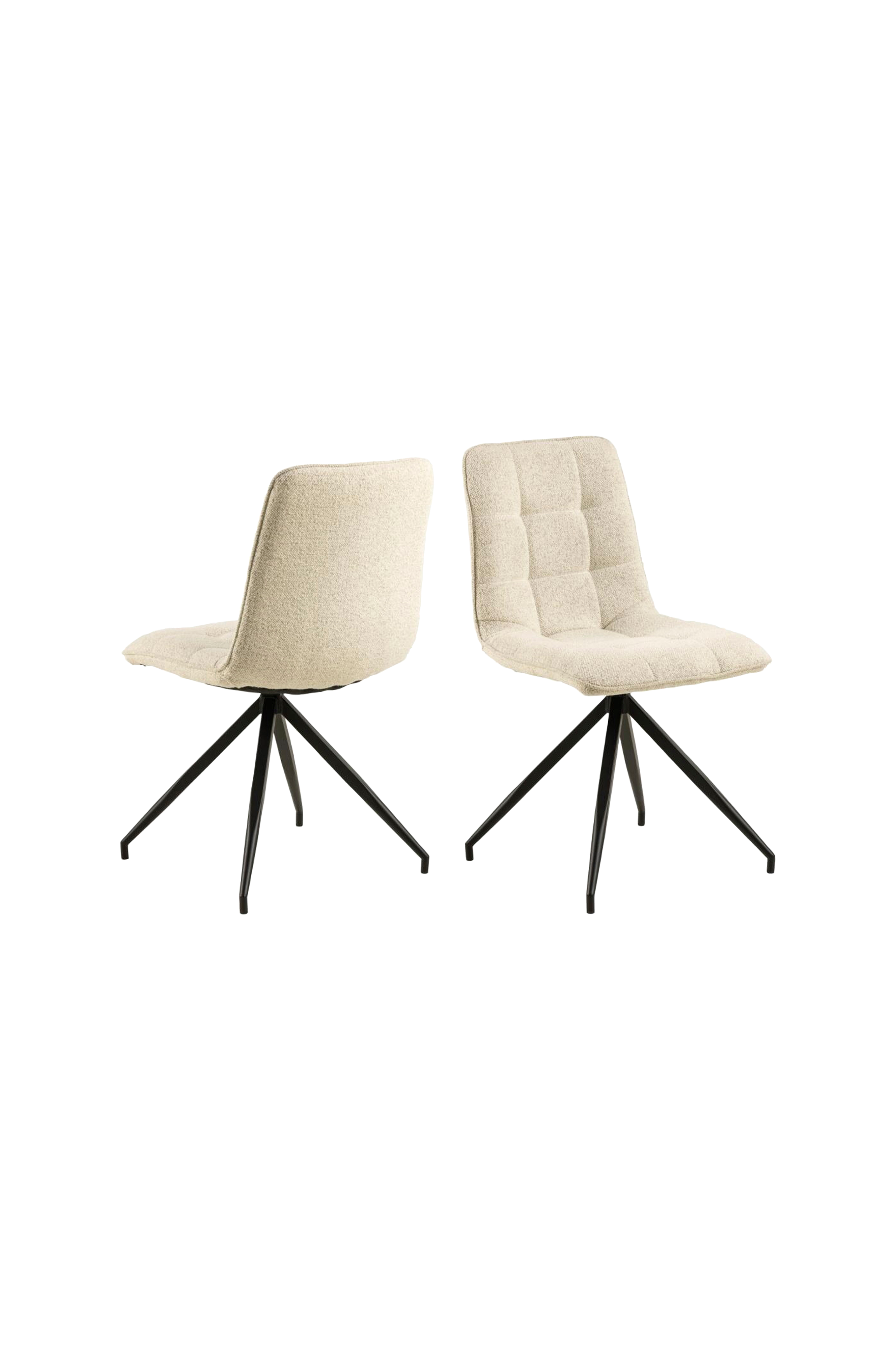 Skap en koselig innredning med denne spisestolen med moderne preg. Setet er designet i en rektangulær form og kledd med et mykt boucléstoff i naturfarge, noe som gir spisebordet et lyst innslag. De dekorative passepoilkantene og firkantede stikninger utmerker setet og gir en behagelig følelse. Svarte metallben.