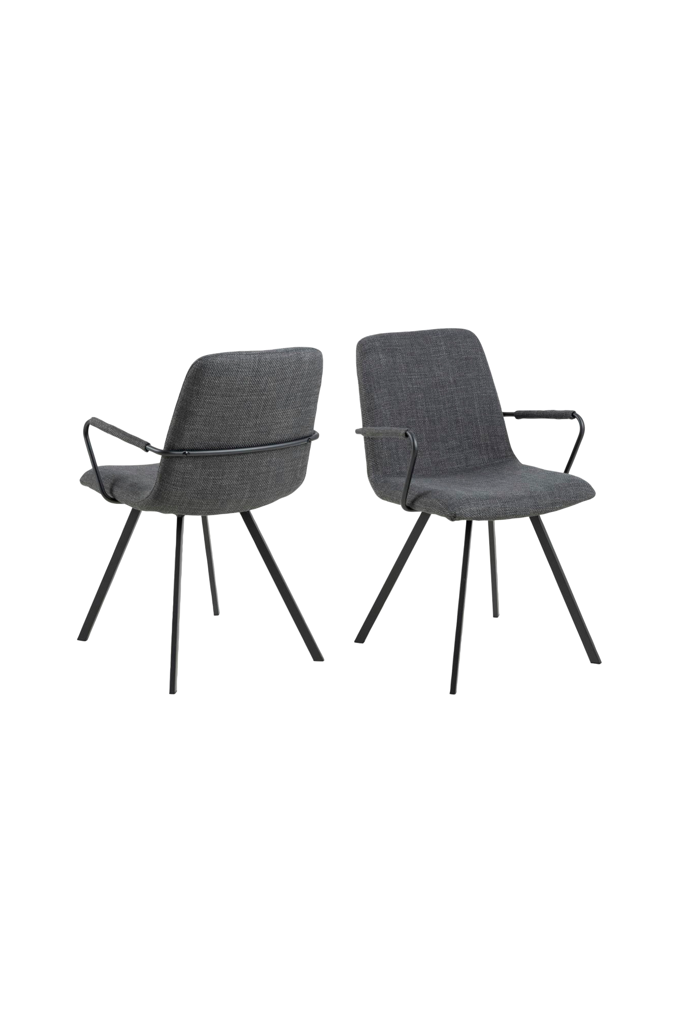 Med elegant sete, armlener og sorte metallben finner denne spisestolen lett sin plass i enhver moderne spisestue. Stolen har et lett utseende som aldri går av moten. For å gi stolen dybde er setet trukket med et strukturert og mykt mørkegrått stoff som smigrer designet med sin tofargede karakter. En slik spisestuestol gjør enhver middag til en koselig opplevelse.