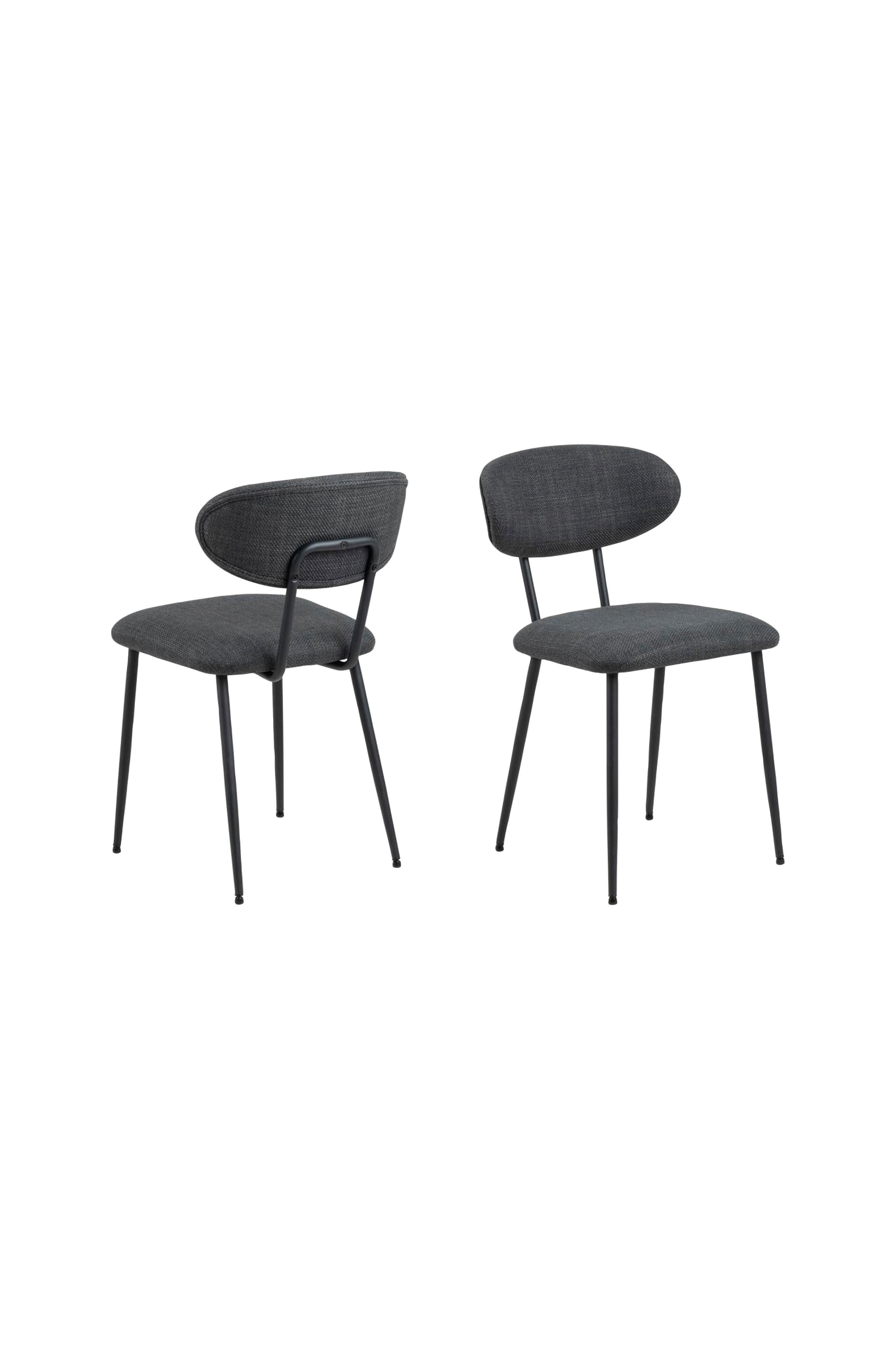 Denne spisestolen er en visuelt tiltalende løsning for enhver moderne spisestue. Den mørkegrå fargen og den tofargede effekten på trekket, som er pakket inn i et strukturert stoff, balanserer den røffe overflaten på de slanke, svarte metallbenene. Stolens allsidige karakter passer inn i ethvert hjem.