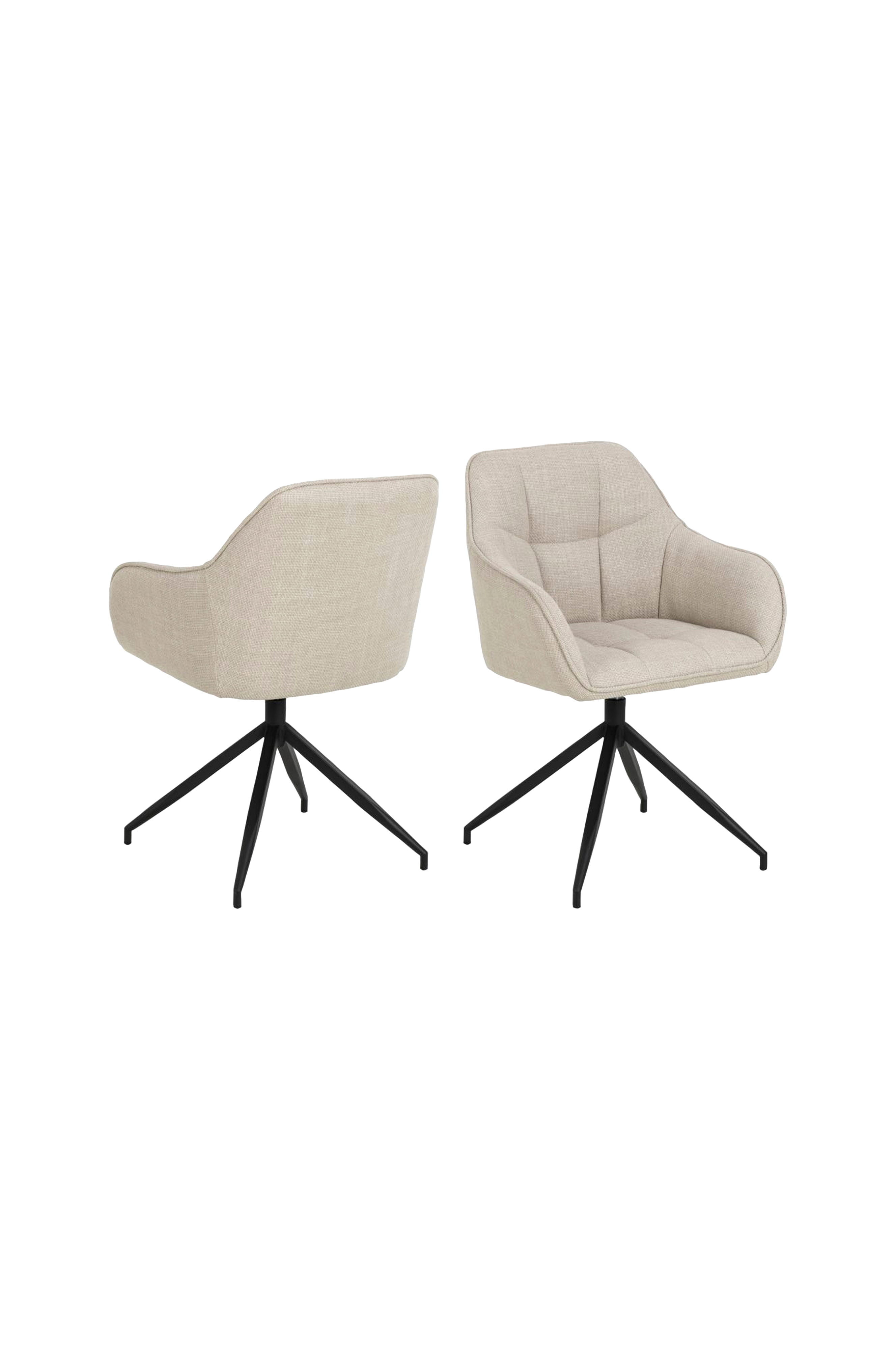 Tilfør design og komfort til spisestuen din. Det beige trekket er dekorert med et kult, kvadratisk søm-mønster som gjør den elegante spisestolen enda mer spennende. Legg merke til stoffets struktur og hvordan den tofargede effekten gir dybde til designet. Stolen har et understell i svart metall og er utstyrt med en svingbar funksjon som gjør det enkelt å snu stolen.
