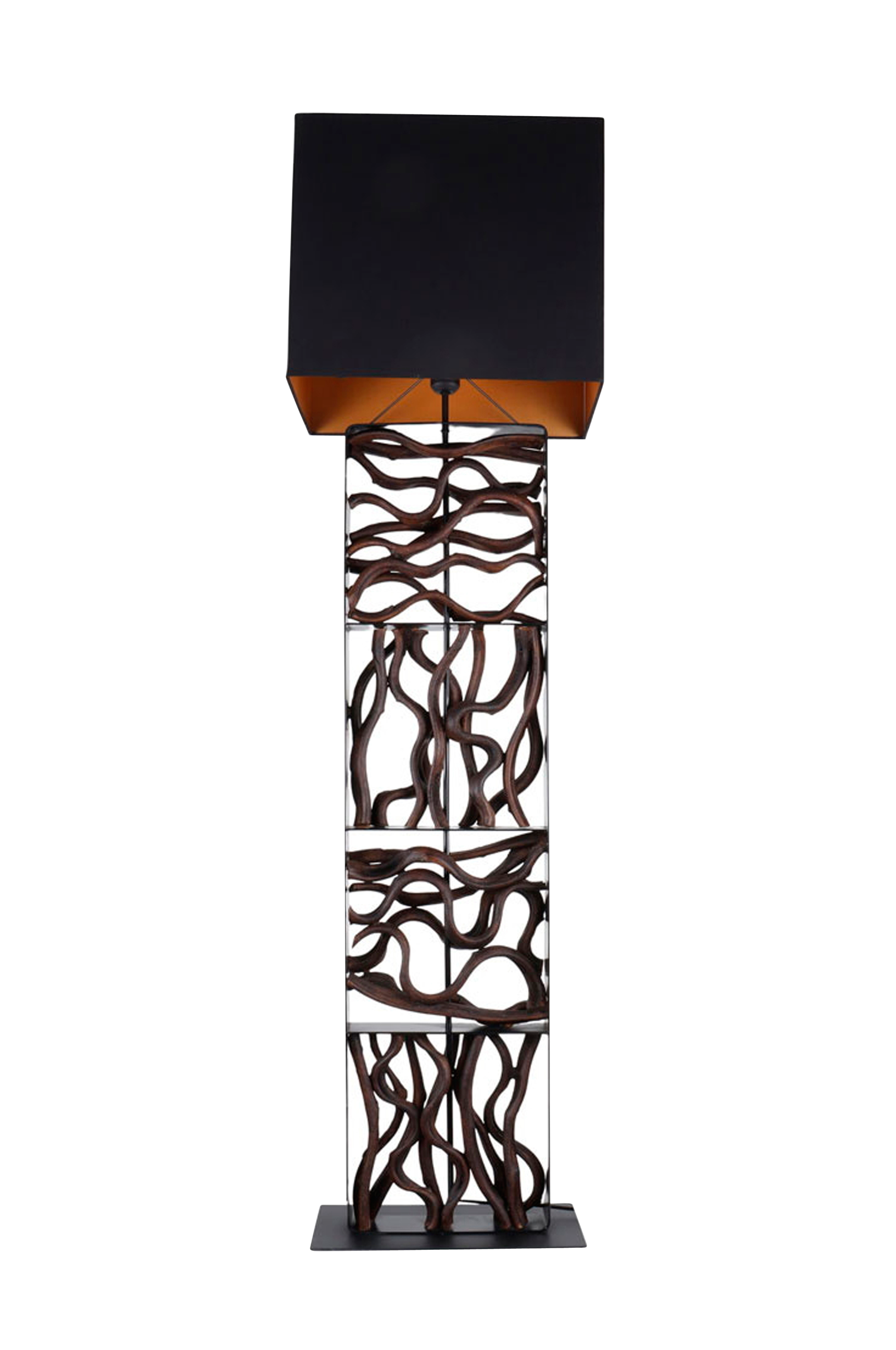 Mørk brun gulvlampe av liane med svart metallramme og fot. Skjermen er svart med gullfarget innside. Lampen er 163 cm høy, 45 cm bred og 30 cm dyp. Ledningslengde ca. 205 cm. Stor sokkel E27 og maks 60 watt.