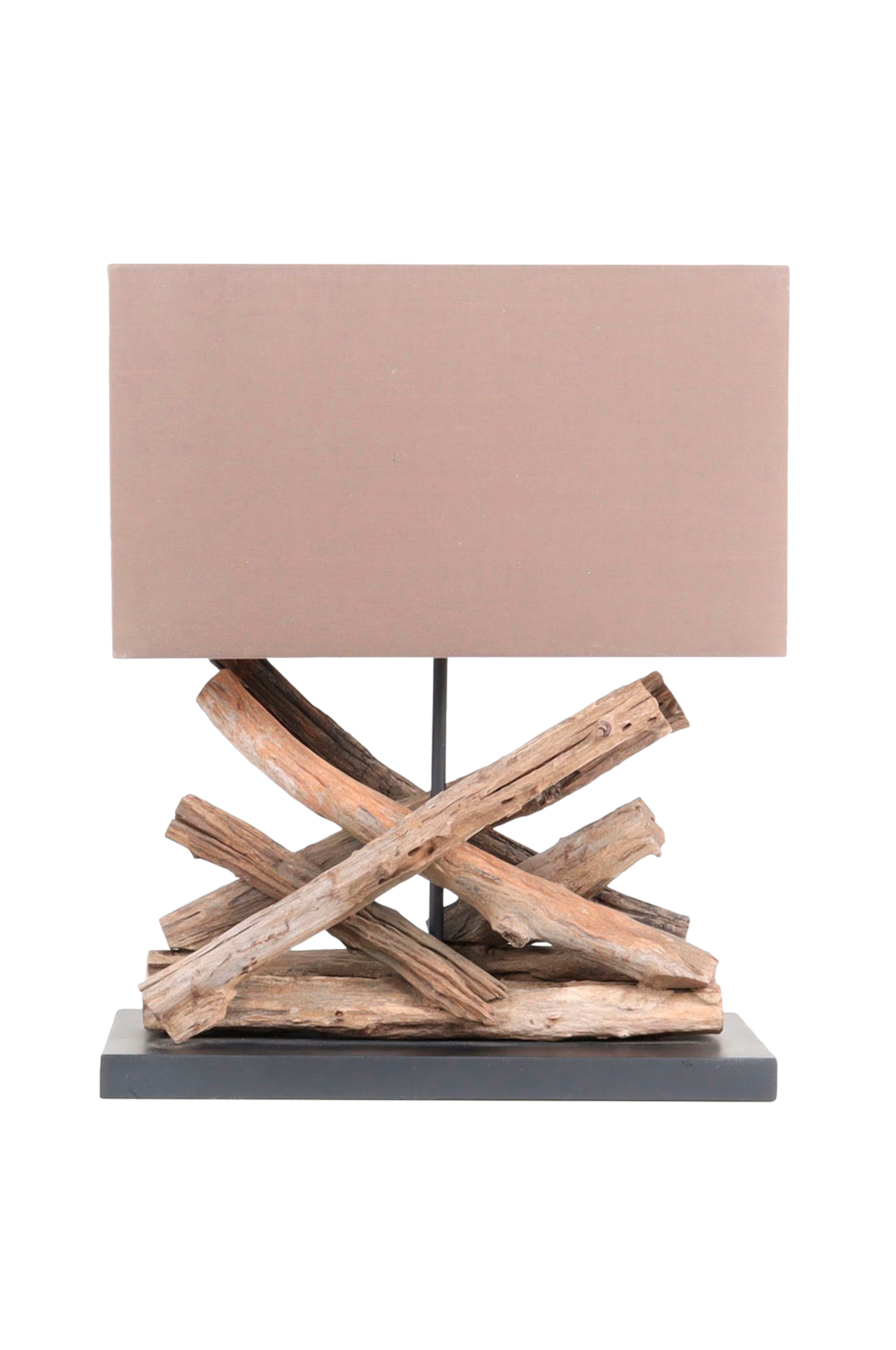 Brun bordlampe av gjenbrukte teakgreiner med beige bomullsskjerm. Lampen er 50 cm høy, 40 cm bred og 20 cm dyp. Ledningslengde ca. 210 cm. Stor sokkel E27 og maks 60 watt.