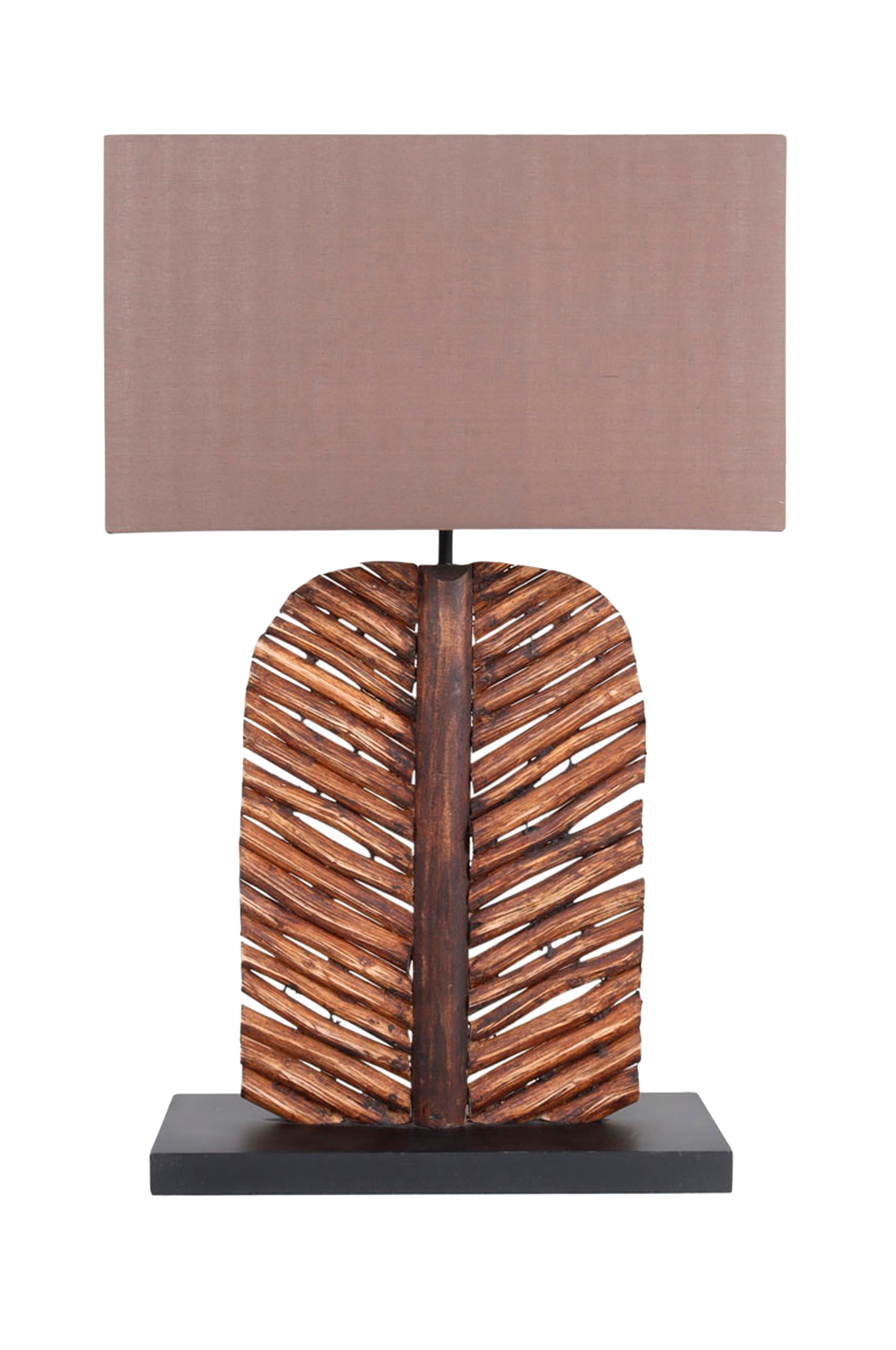Brun bordlampe av naturtre med beige bomullsskjerm. Lampen er 63 cm høy, 40 cm bred og 20 cm dyp. Ledningslengde ca. 235 cm. Stor sokkel E27 og maks 60 watt.