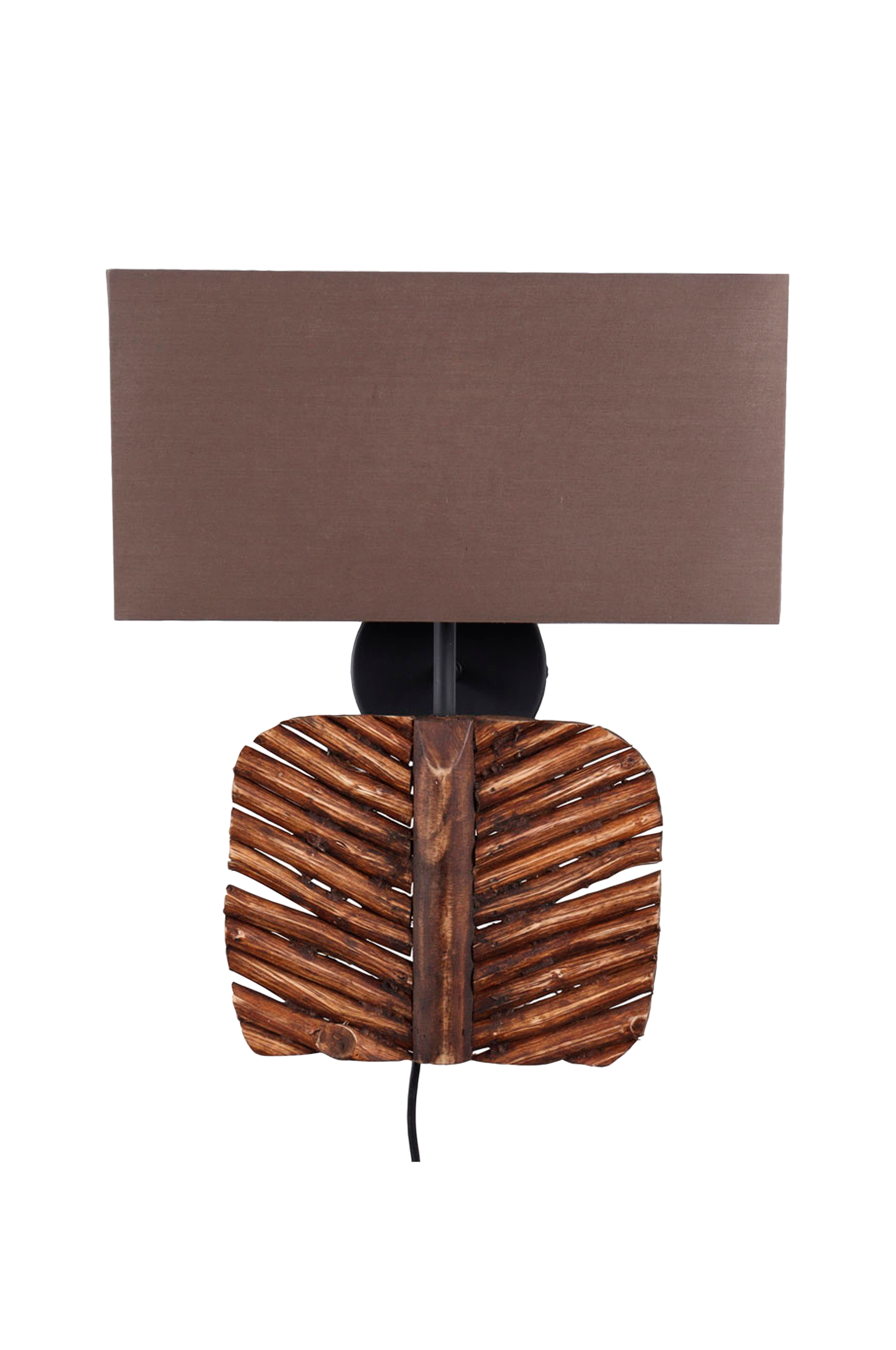 Brun lampett av naturtre med beige bomullsskjerm. Lampetten er 45 cm høy, 35 cm bred og 18 cm dyp. Ledningslengde ca. 2 m. Stor sokkel E27 og maks 60 watt.