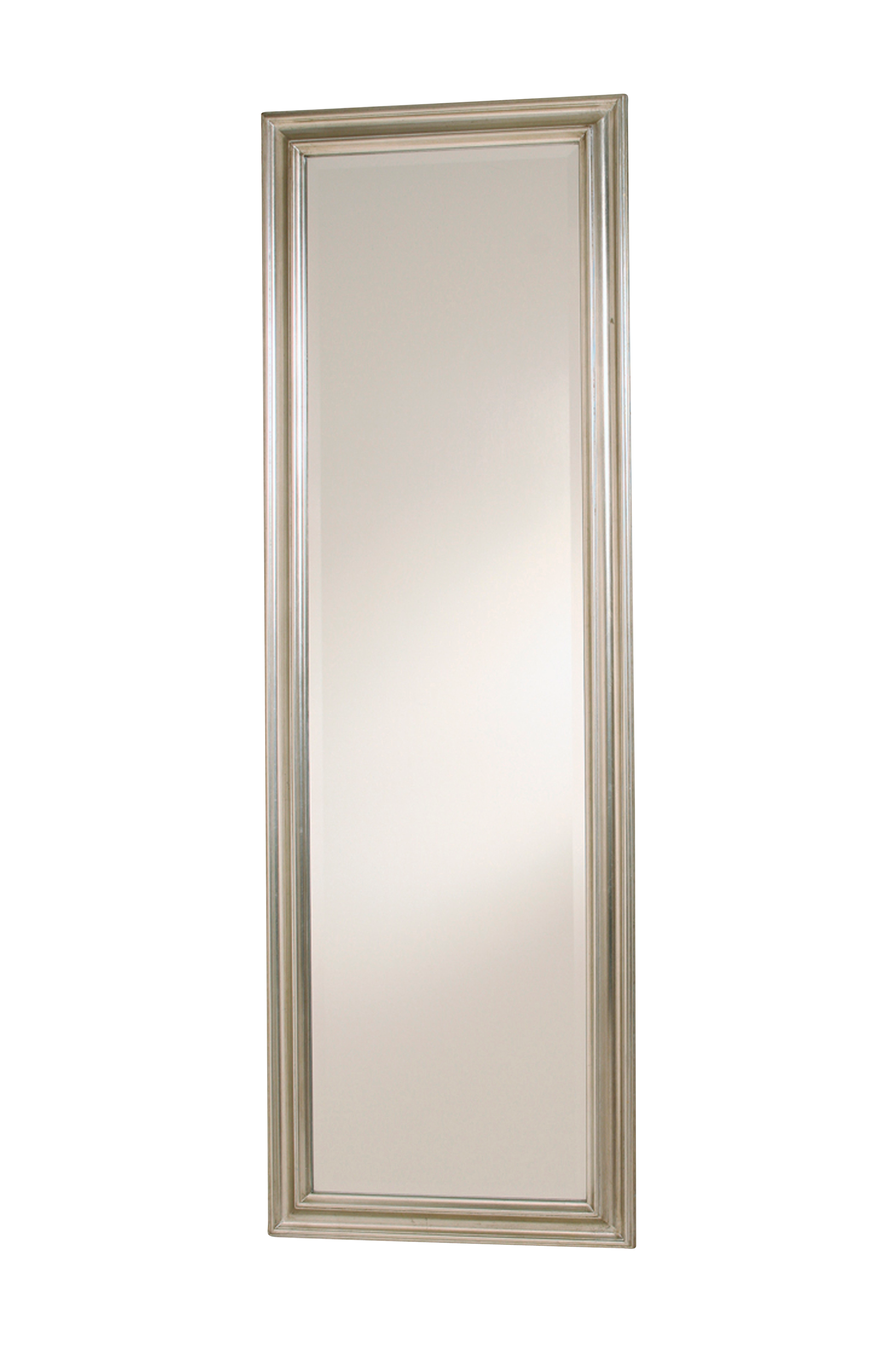 Speil i sølvfarget keisertre. Speilet har fasettkant, er 53 cm bredt, 157 cm høyt og 4 cm dypt. Leveres med feste til å henge speilet enten liggende eller stående.