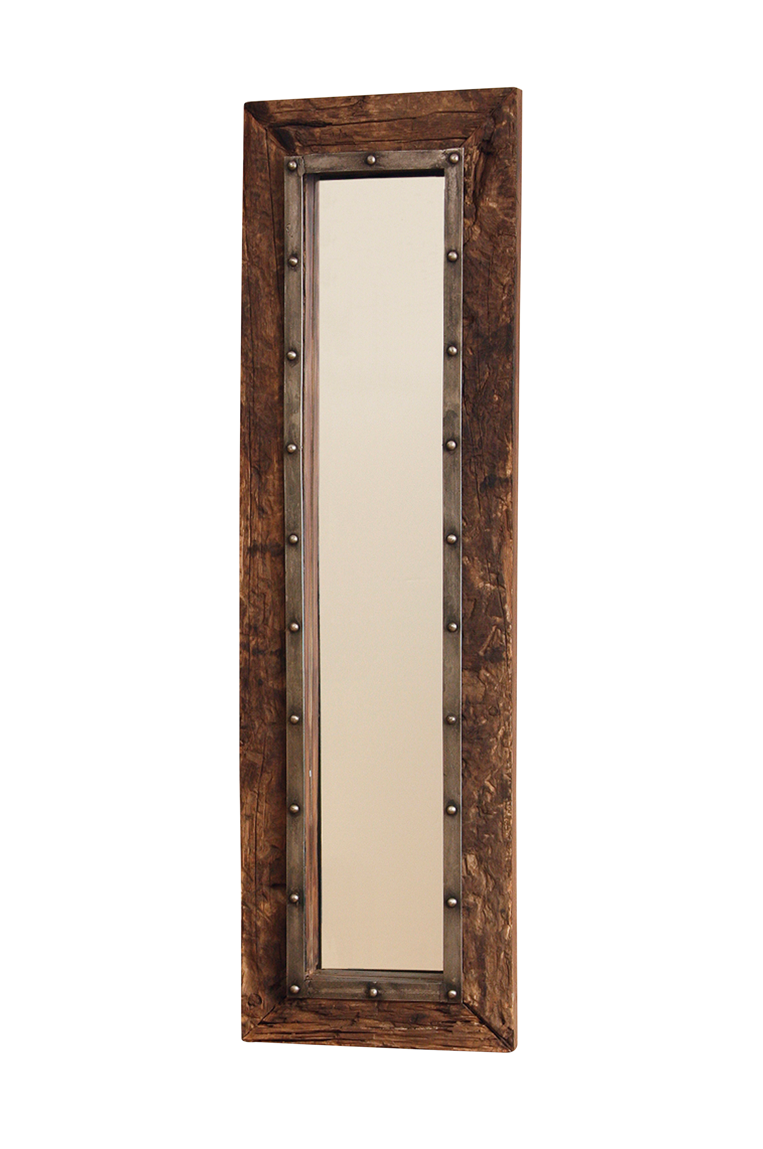 Speil i gjenvunnet tre med ramme med jernnagler rundt speilglasset. 32 cm bredt. 107 cm høyt og 6 cm dypt. Leveres med feste for å henge speilet stående.