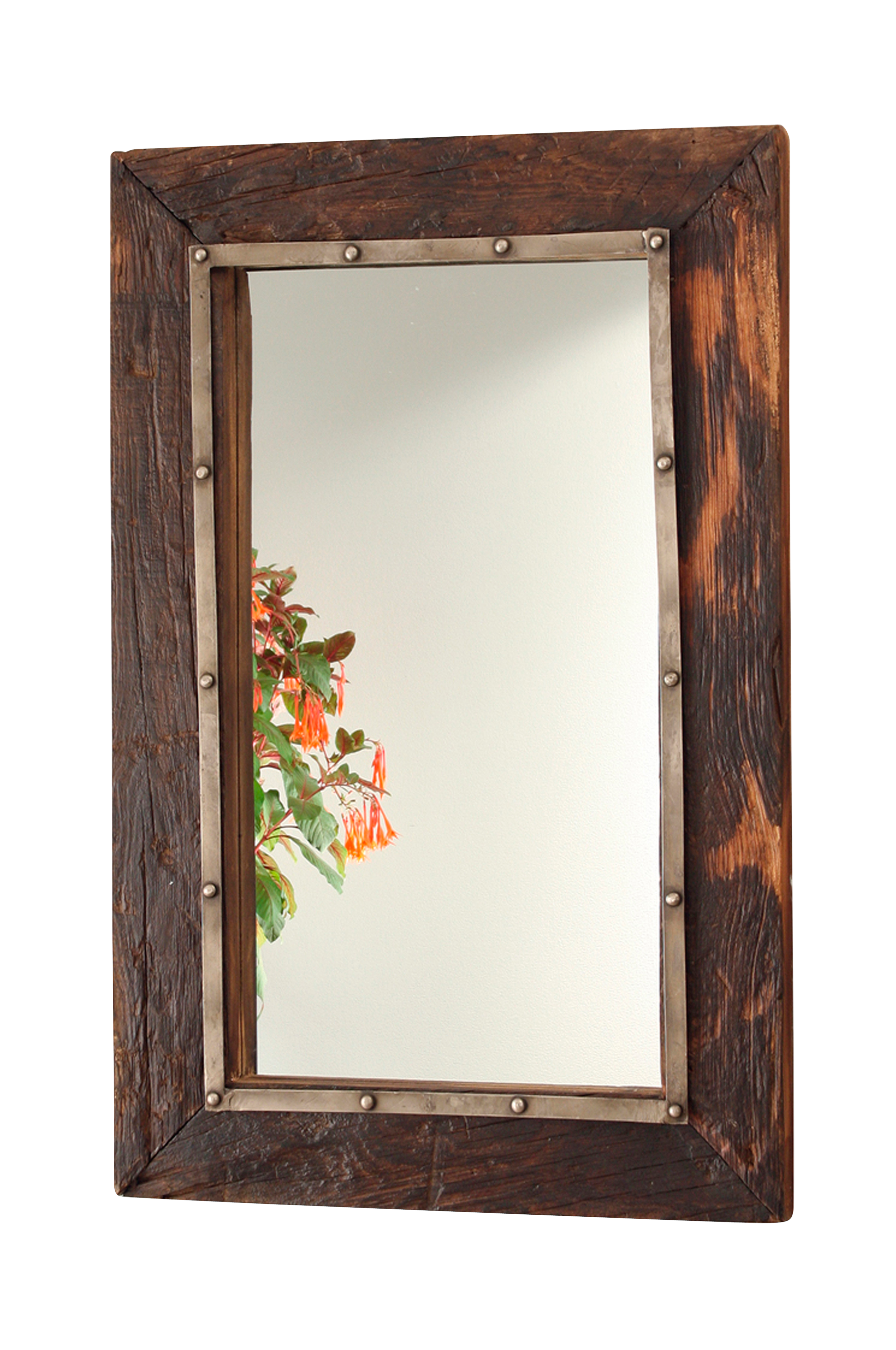 Speil i gjenvunnet tre med ramme med jernnagler rundt speilglasset. 58 cm bredt. 88 cm høyt og 6 cm dypt. Leveres med feste for å henge speilet stående.