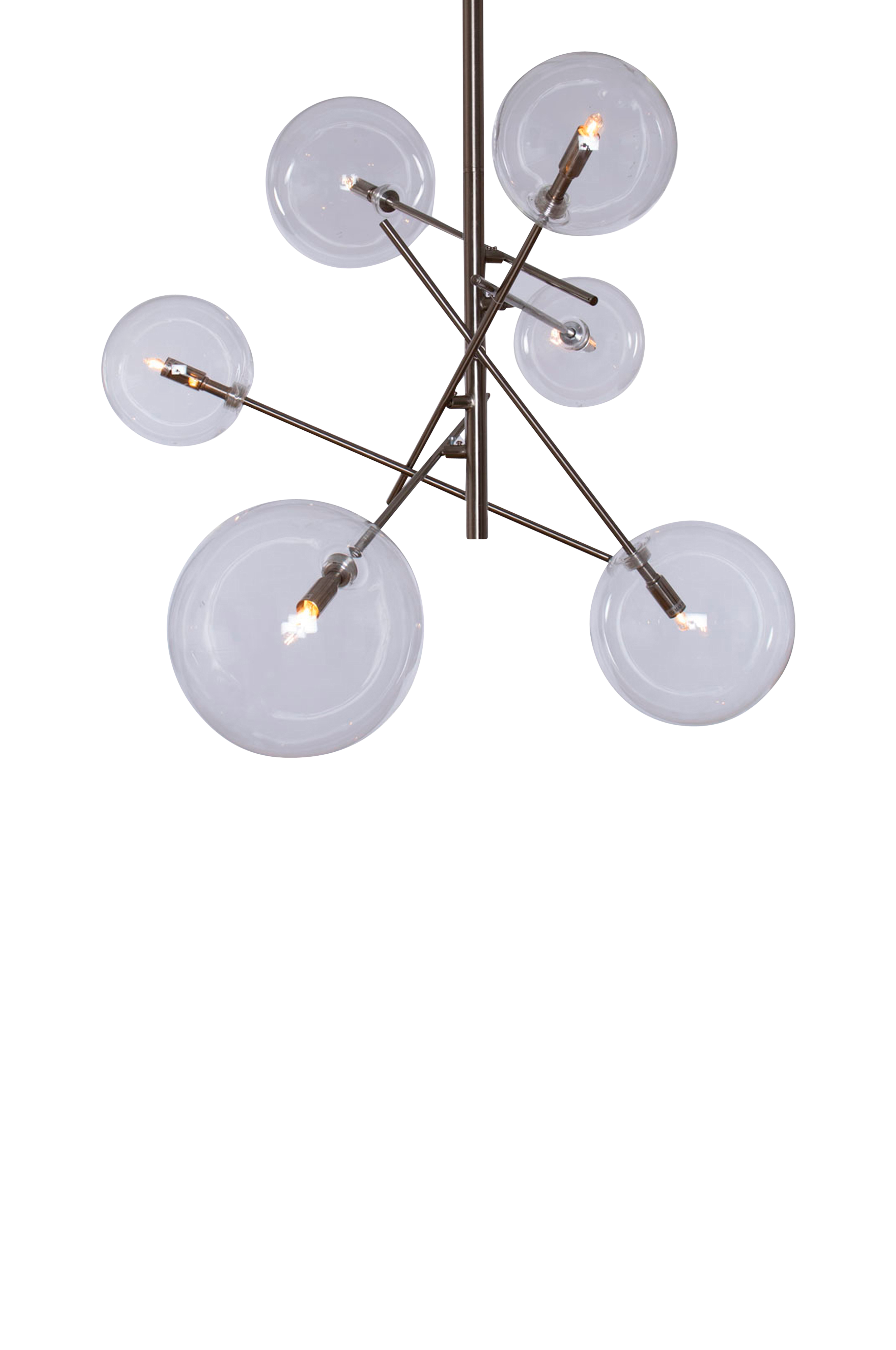 Taklampe Sphere i børstet sølvfarge med 6 lyskilder i 6 glasskupler. Moderne taklampe i enkel og nedtonet stil. Lampen har seks justerbare armer. Bredde ca. 90 cm. Høyde ca. 40-90 cm. Ledningslengde 20 cm. Sokkel G9 maks 35W. Lyspærer medfølger ikke.