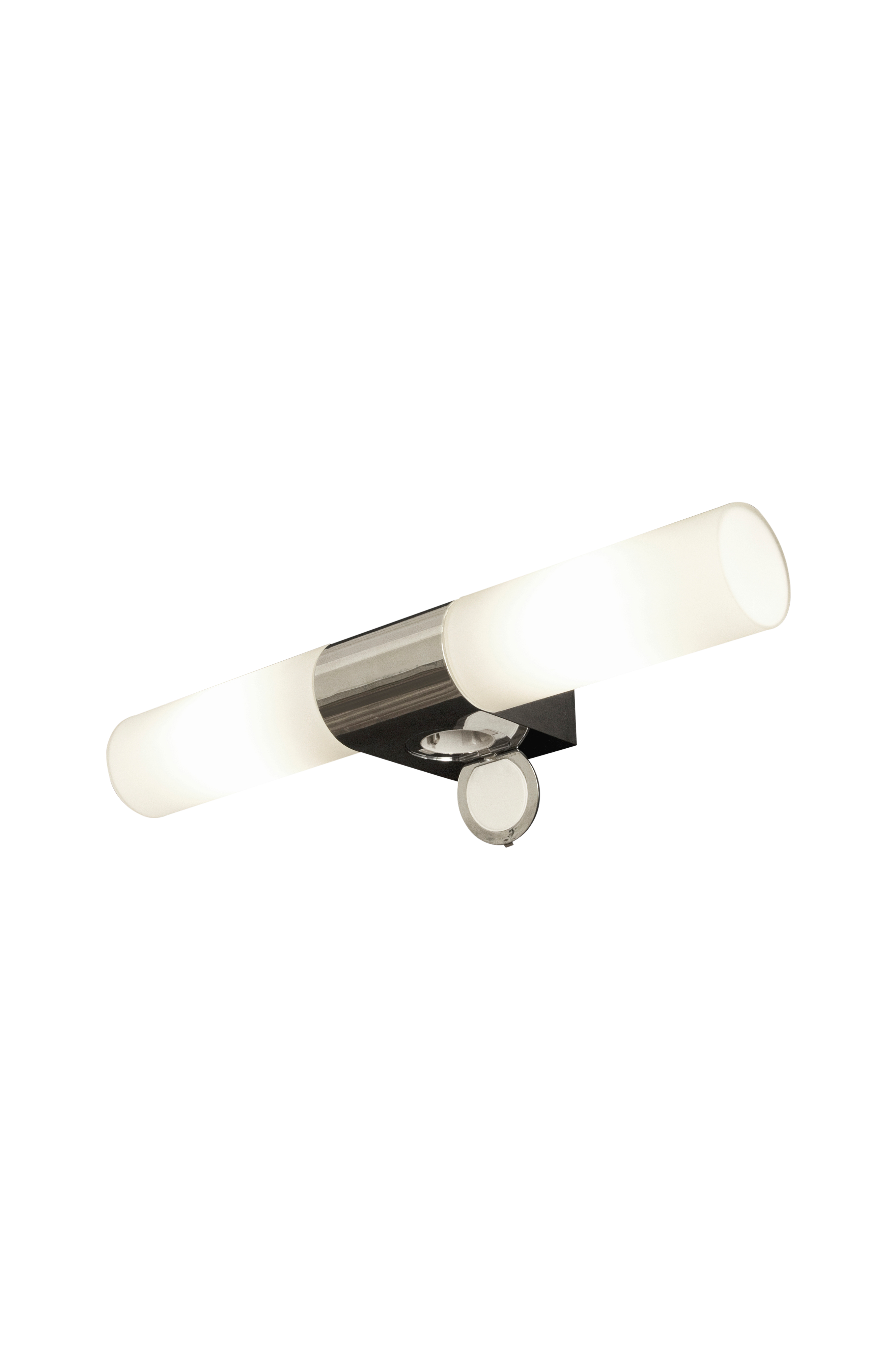 MARCO vegglampe dobbel IP44, krom. Vegglampe for plassering ovenfor speilet på baderommet, med strømuttak. Koble f.eks. barbermaskin eller hårføner rett i lampen. Materiale: metall og glass.