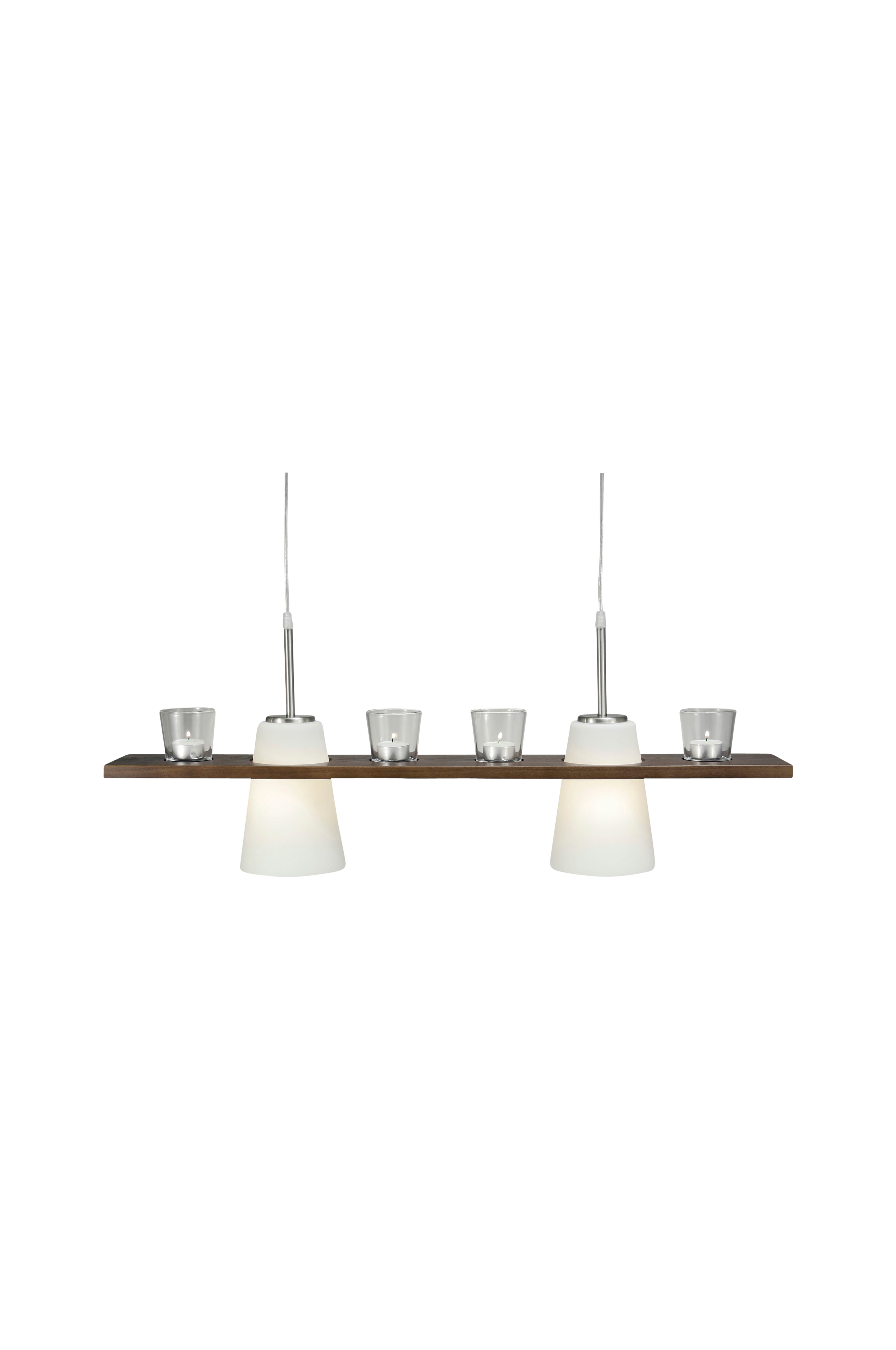 PLANKAN taklampe, valnøtt/hvit. Lampe med glassholdere til telys. Høyden er justerbar. Materiale: tre, glass og metall