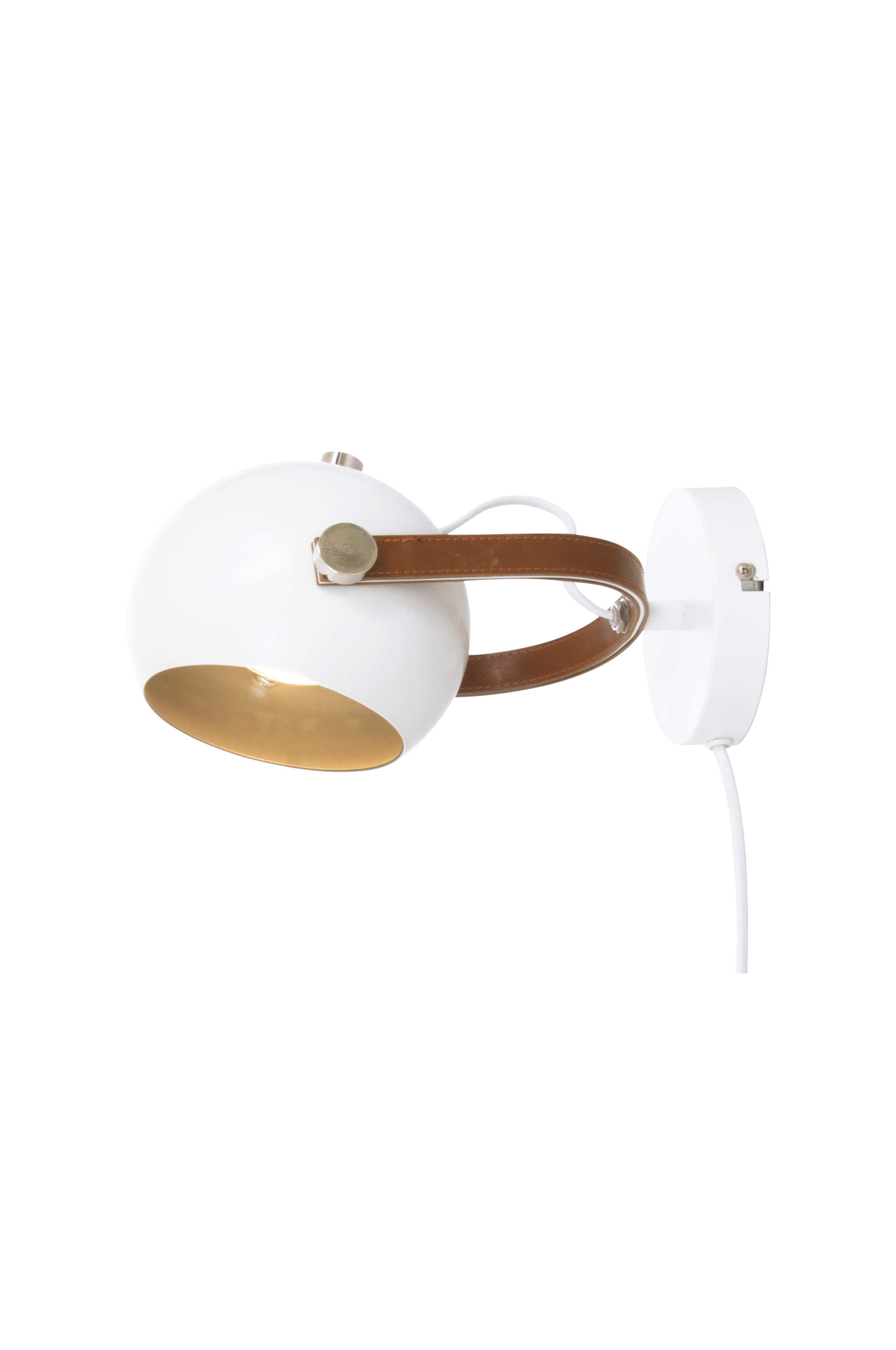 BOW vegglampe. Lampehodet kan justeres til ønsket posisjon. Strømbryter på ledningen. Materiale: metall og kunstskinn
