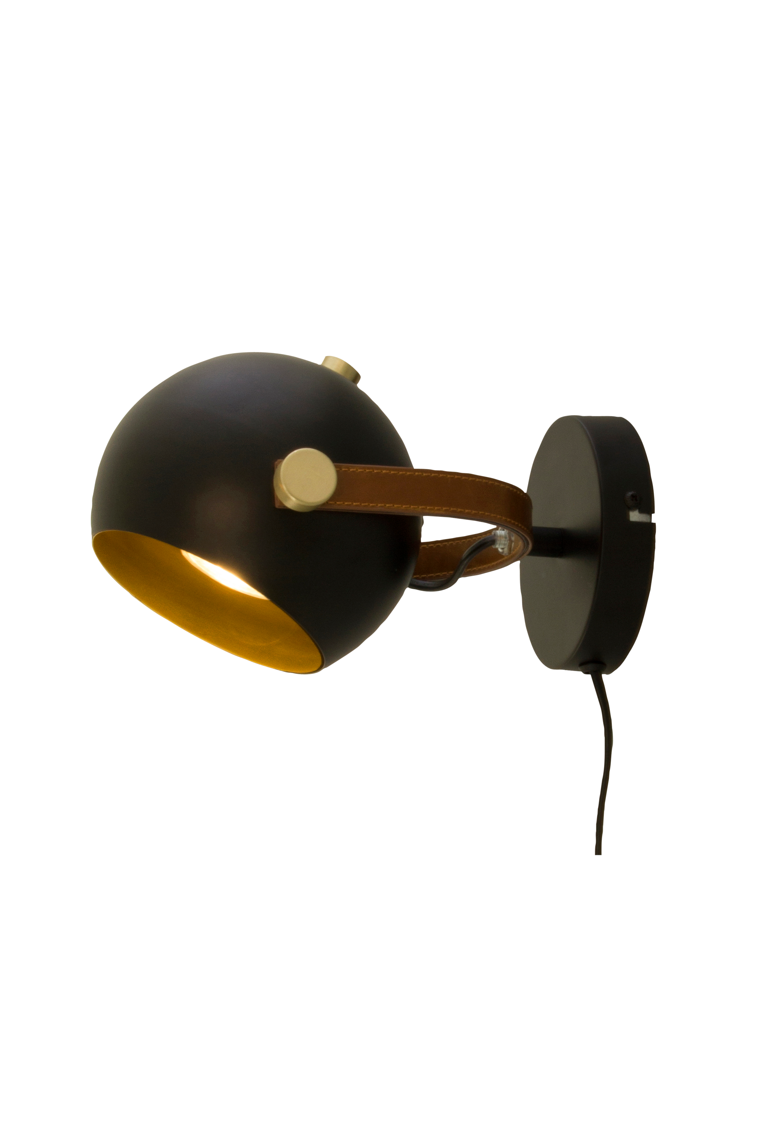 BOW vegglampe. Lampehodet kan justeres til ønsket posisjon. Strømbryter på ledningen. Materiale: metall og kunstskinn