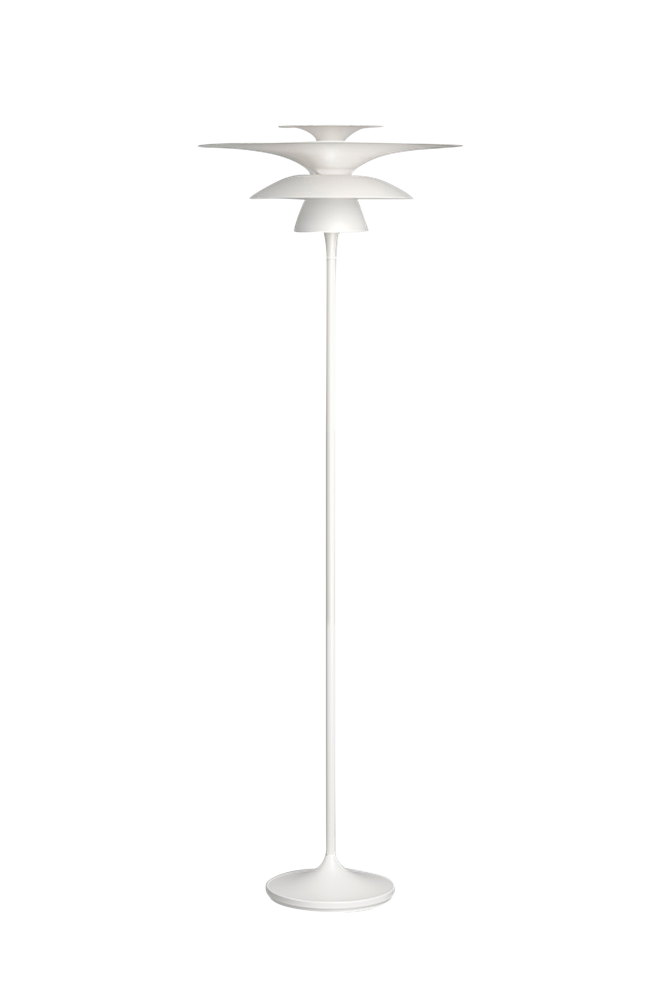 Picasso-familien består av pendler, bord- og gulvlampe. For at gulvlampen skal kunne passe inn i interiøret i flere år, har vi valgt å holde designen enkel og elegant. Picassos metallskjerm i ulike størrelser gir et vakkert lys. Passer i stue og soverom. Lyspære er ikke inkludert. Sokkel G9. 10 watt. IP20. Dimbar. Svart tekstilkledd ledning, lengde 1,7 m. Bryter på ledningen. Høyde 148,6 cm og diameter 50 cm. Klasse II. Designer Joakim Fihn. Produsert i Varberg, Sverige.