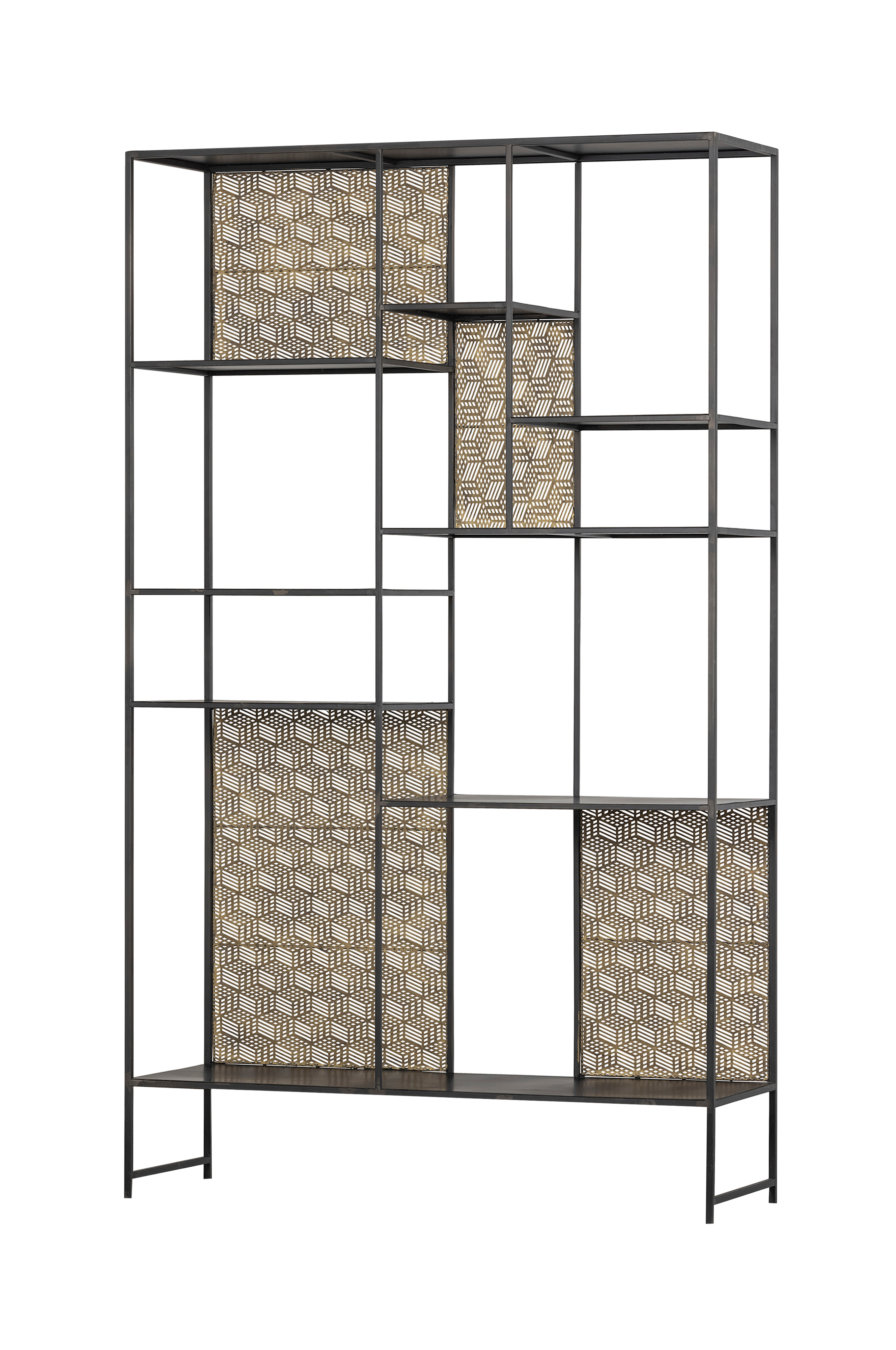 Du blir aldri lei av å se på den lekent komponerte hyllen Framed. Hyllen Framed, fra en kolleksjon fra det nederlandske merket BePureHome, skiller seg ut på grunn av de lekne panelene bak, i ulike størrelser og med interessant mønster. Disse slående panelene er farget i antikk messing, noe som gir en vakker kontrast til den matte, svarte stammen.