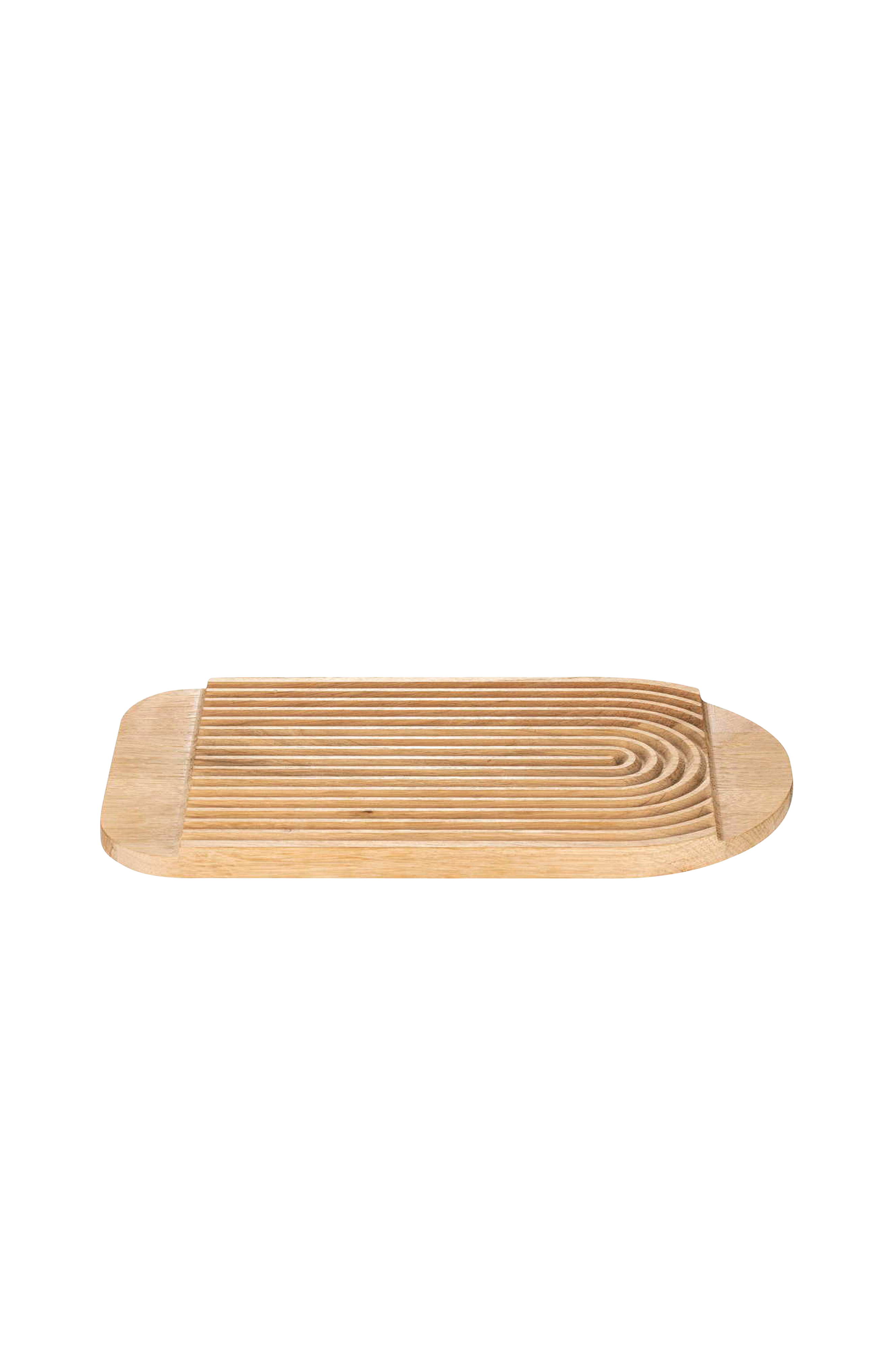 ZEN skjærefjøl/brett av eik kan brukes på begge sider, og kombinerer dermed funksjonen til et brett og en brødfjøl i ett. Sporene fanger opp smuler når man skjærer brød. Brettet har en opphøyd kant, noe som også gjør at det passer som elegant serveringsbrett.