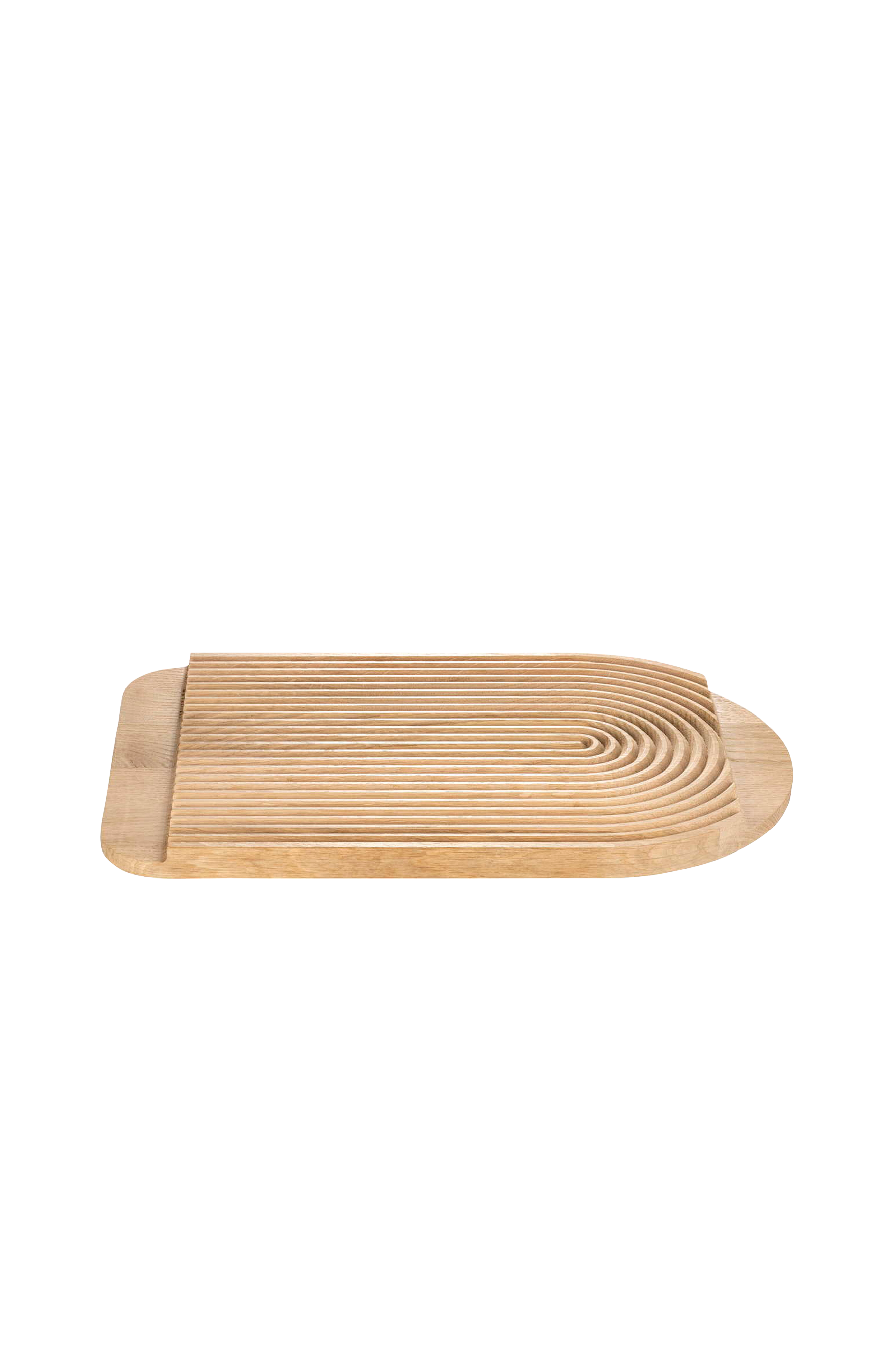ZEN skjærefjøl/brett av eik kan brukes på begge sider, og kombinerer dermed funksjonen til et brett og en brødfjøl i ett. Sporene fanger opp smuler når man skjærer brød. Brettet har en opphøyd kant, noe som også gjør at det passer som elegant serveringsbrett.