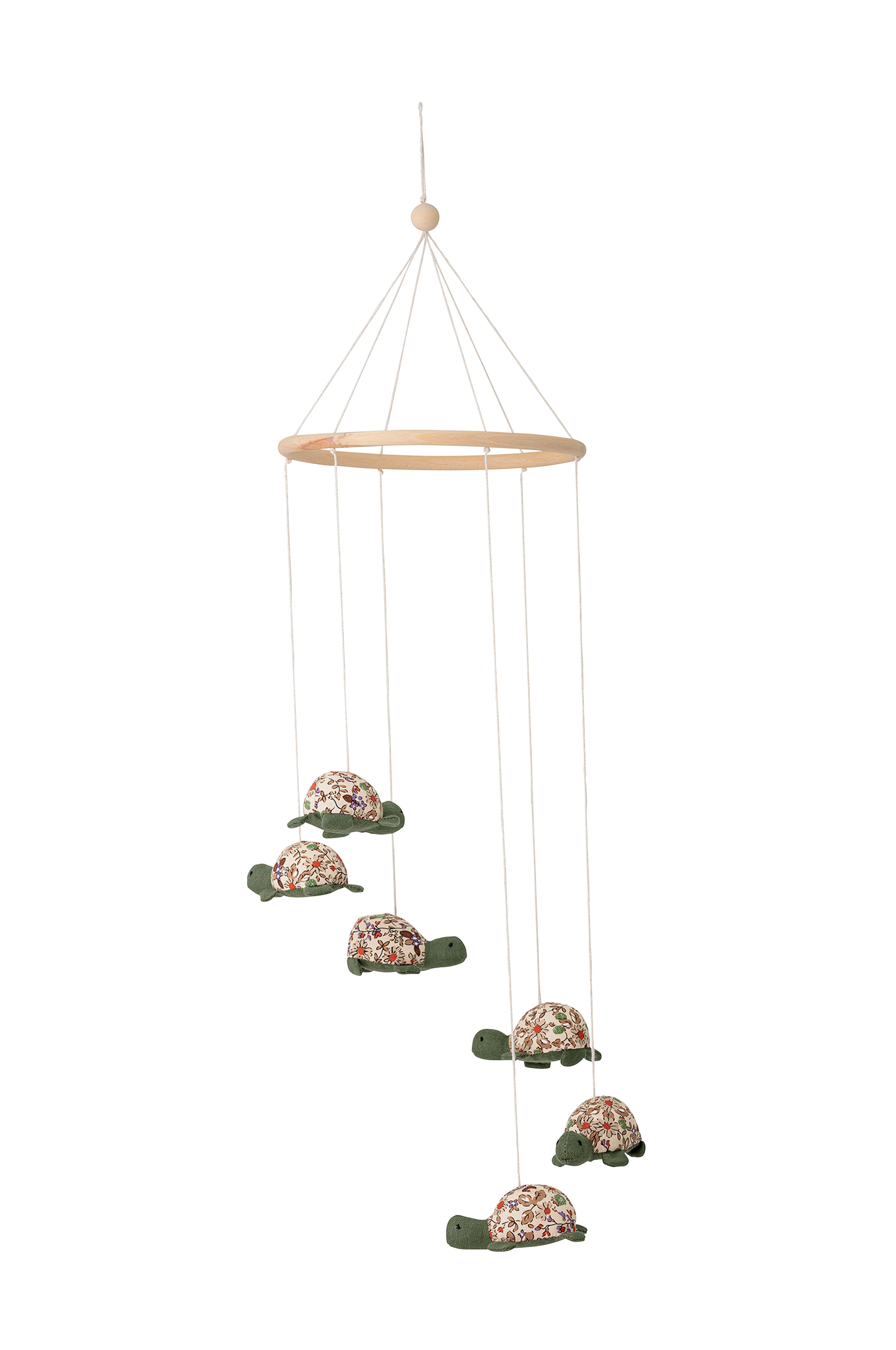 Søt uro med små skilpadder. La de minste øve på øye-hånd-koordinering. Men husk at dette ikke er en leke. Av bambus og polyester.