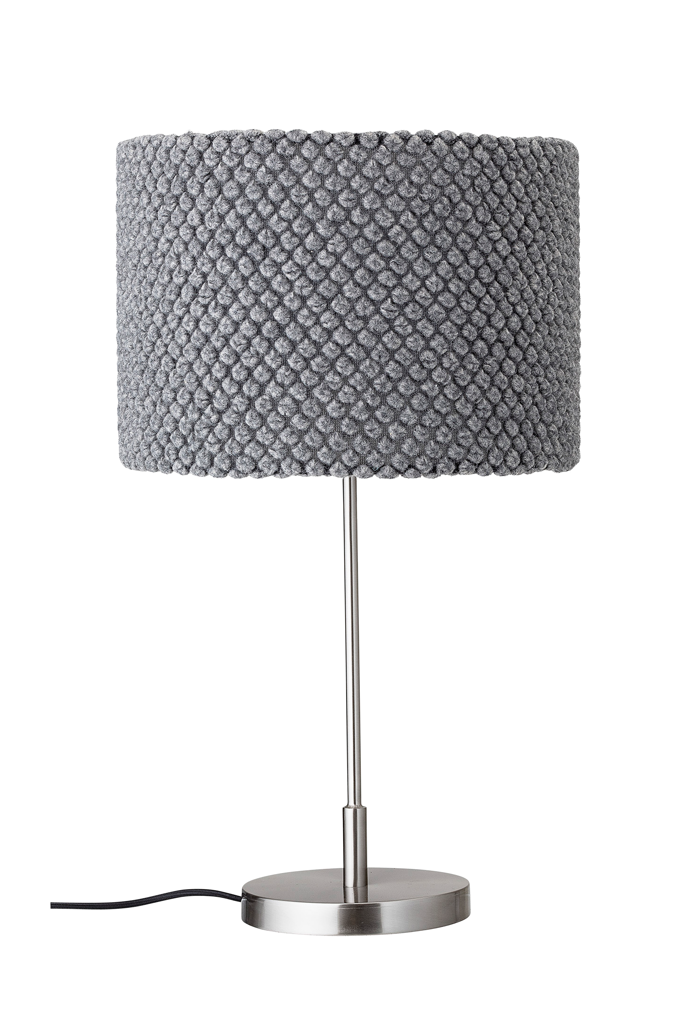 Vacker bordlampe med lampeskjerm av grått ullmateriale og fot av metall.