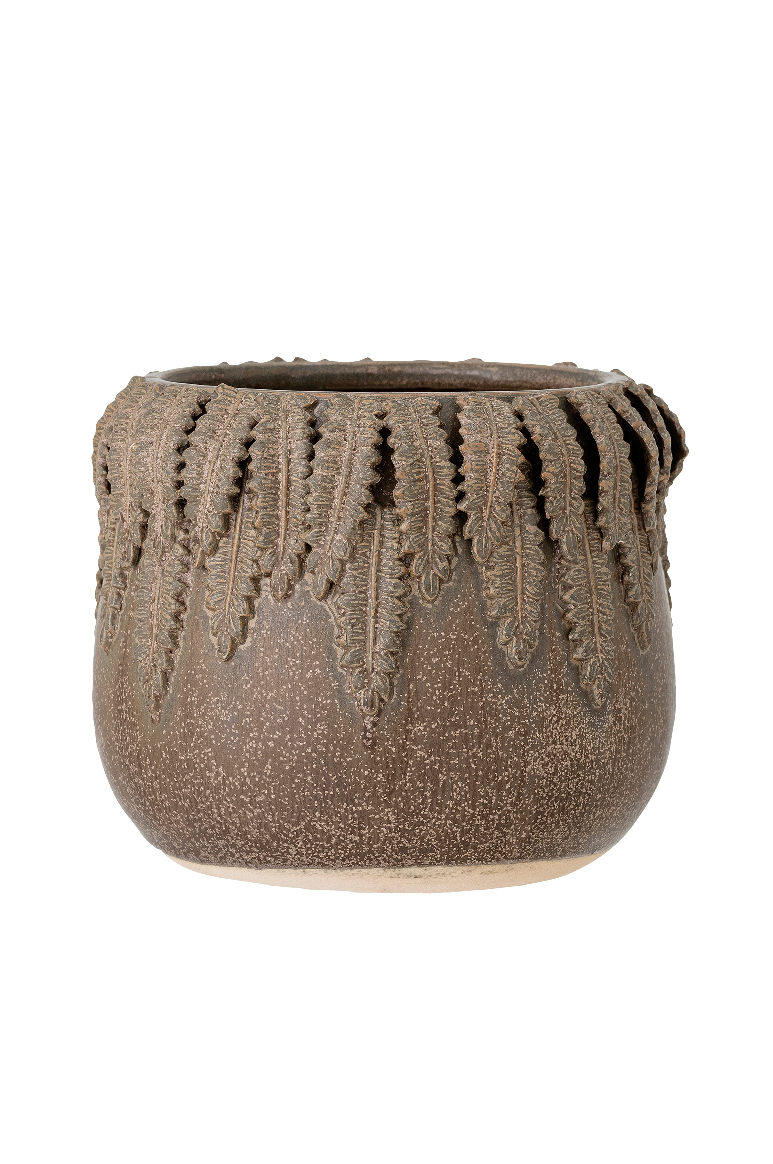 Eloi blomsterpotte fra Creative Collection er et vakkert komplement i ethvert rom. Den brune fargen passer til alle mulige interiører, og er perfekt sammen med favorittplanten. Det botaniske mønsteret er karvet i steintøyet for hånd.