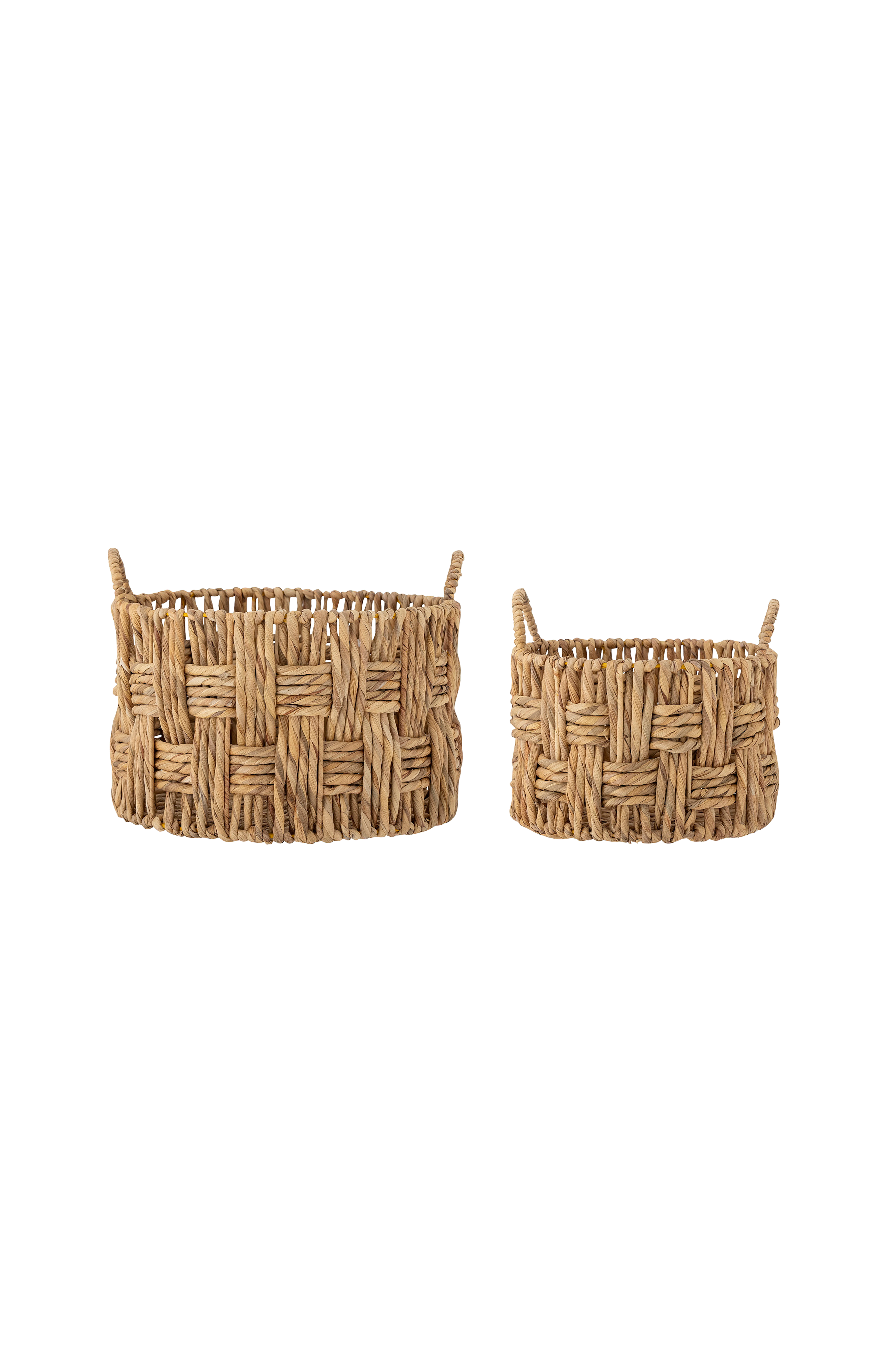 Pepita kurv fra Bloomingville er et sett med to fine kurver av vevd vannhyasint med dekorative håndtak. De er perfekte for oppbevaring av ulike småsaker, og kan også brukes som pynt i hjemmet. Den naturlige fargen og det rustikke utseendet gir innredningen en varm og koselig følelse. D30xH27/D40xH30 cm, 2 stk.