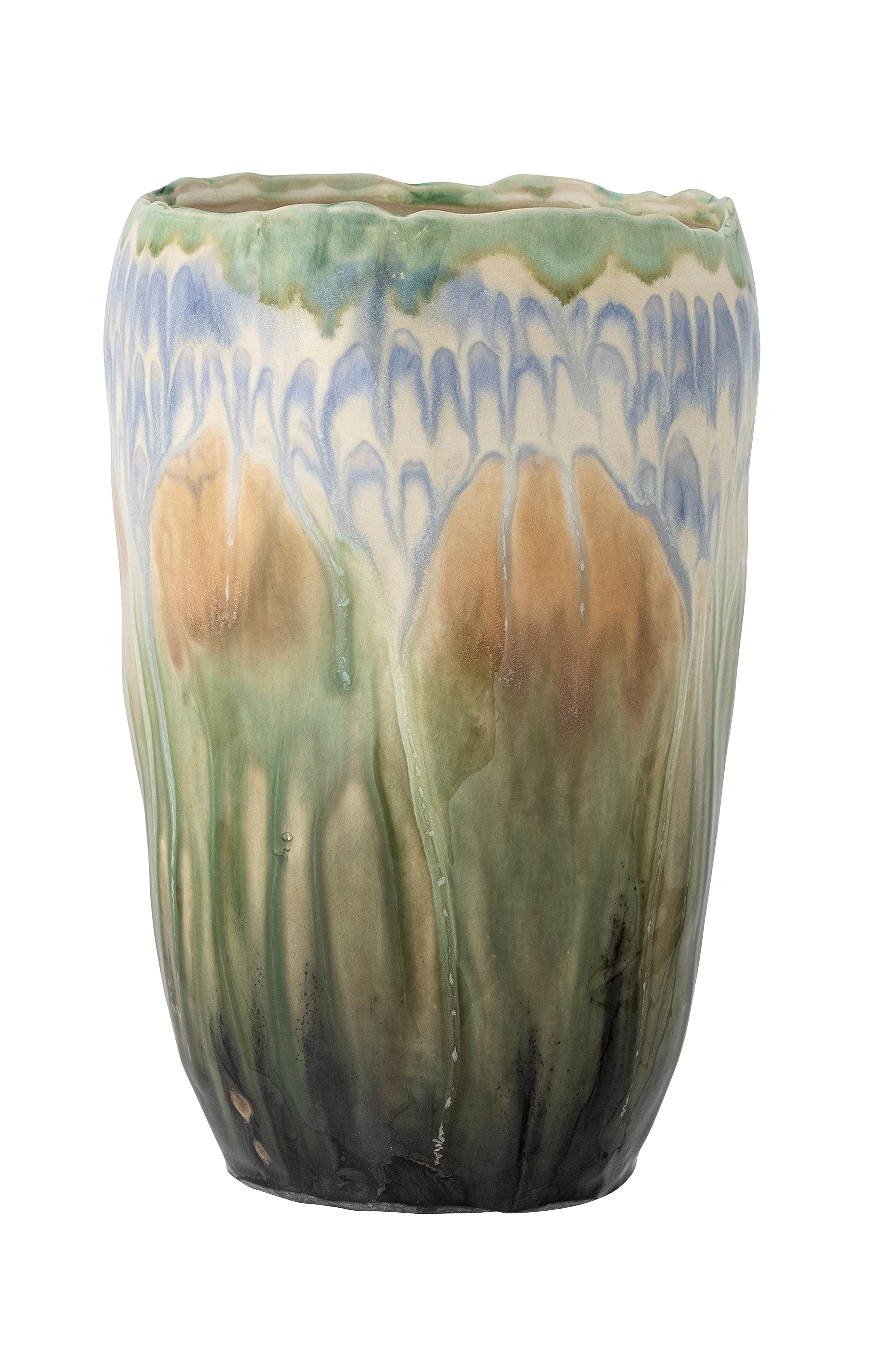 Vasen mahasti fra creative collection er en nydelig vase i en unik glasur med en rennende effekt i lyseblå, grønne og brune nyanser. Vasen er håndmalt, så hver enkelt vase vil variere og være unik. D17xh26 cm