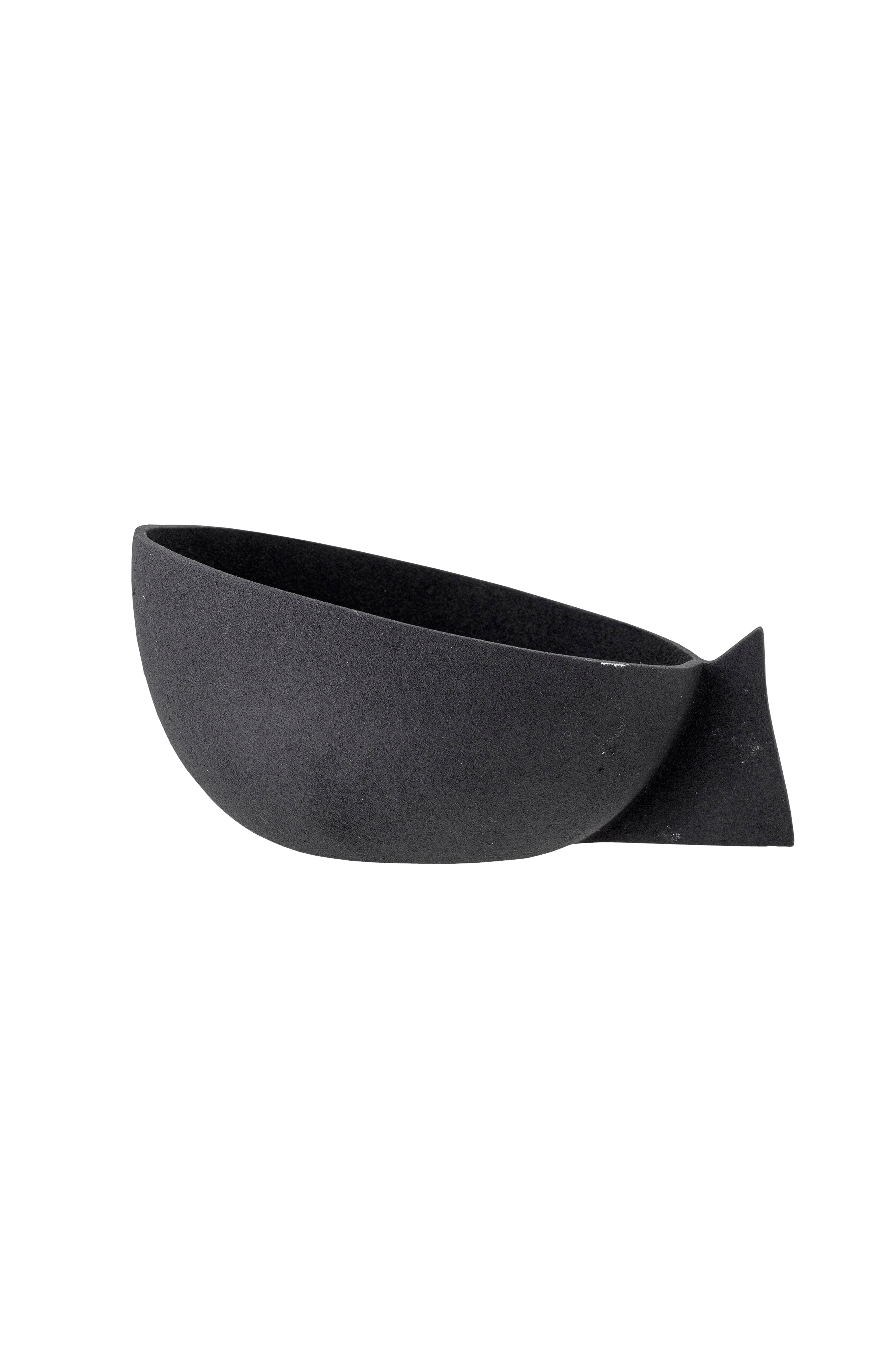 En dekorativ og annerledes skål. Den skrå designen i kombinasjon med den halelignende detaljen på den ene siden gir skålen et distinkt utseende. Skålen er produsert i aluminium og farget svart for å få en grov tekstur med metallfinish. Skålen er dekorativ som den er, og kan brukes til oppbevaring av småting eller kombineres med andre pyntegjenstander.