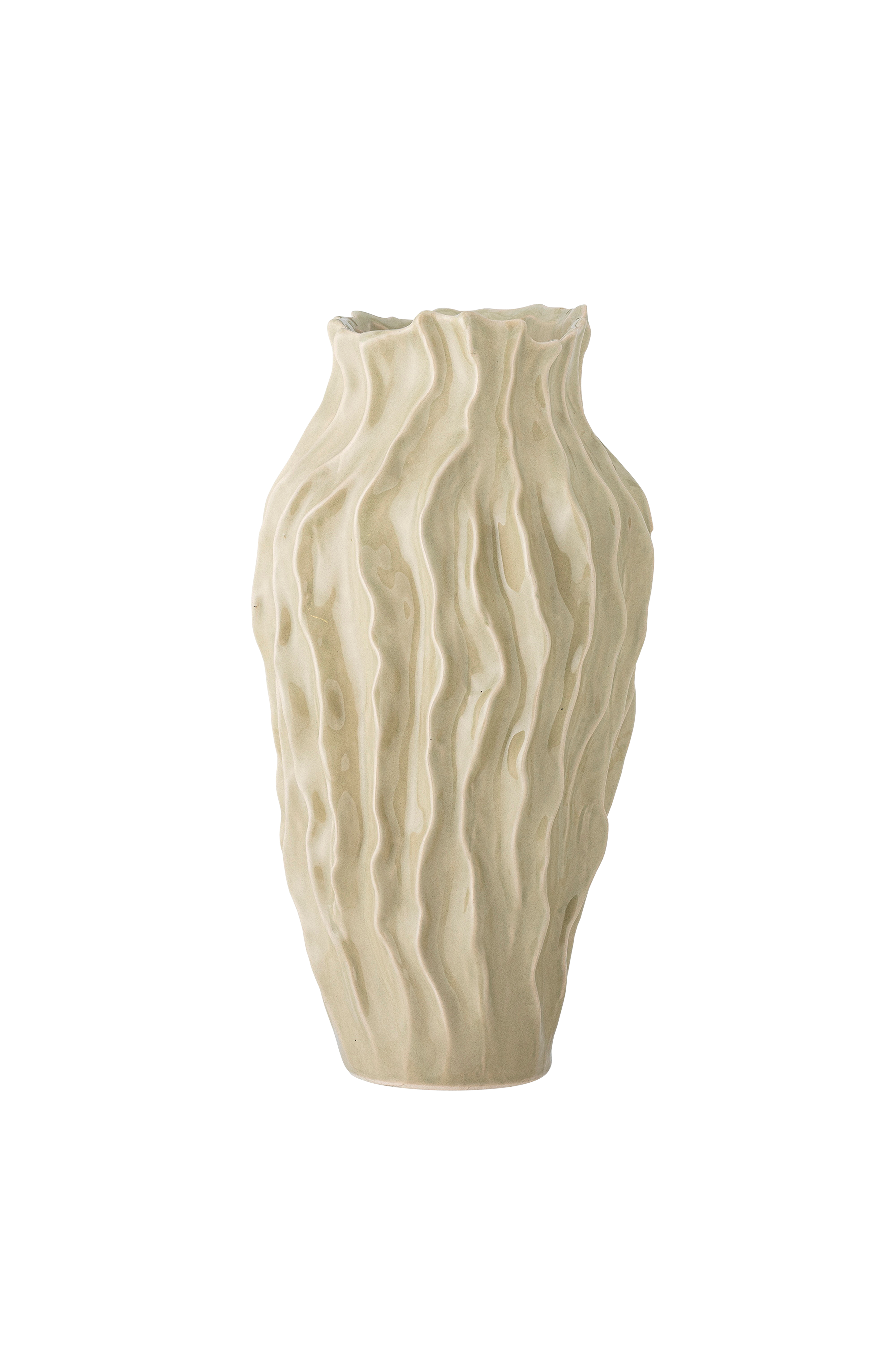 valeria vase fra bloomingville kombinerer organiske former med en moderne estetikk. Vasens bølgende silhuett og den myke, nøytrale glasuren fremhever de naturlige linjene og skaper en følelse av bevegelse. Vasen er et blikkfang som tilfører et elegant preg til enhver innredning. Glasuren kan forårsake variasjoner i fargen. Dimensjon: d20xh38 cm