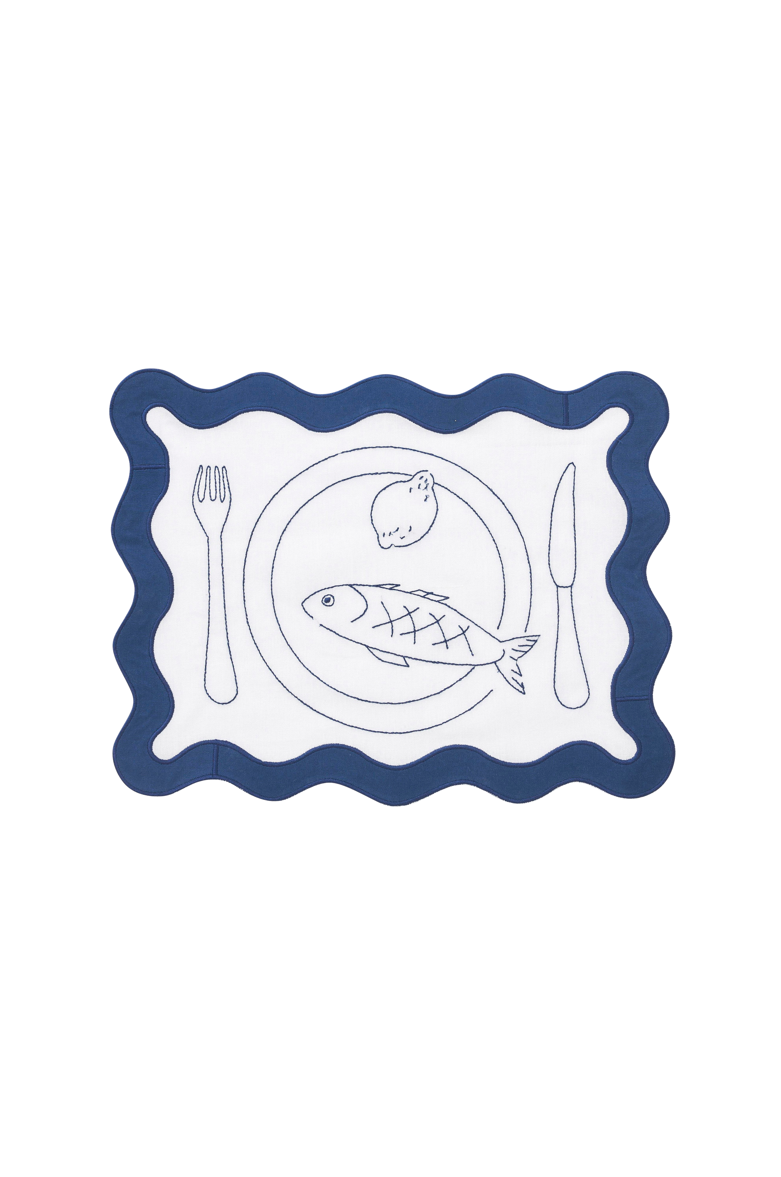 Gjør måltidet til en kunstnerisk opplevelse. Inspirert av matens skjønnhet, har bordserviset en fisk og en sitron vakkert anrettet på en tallerken. Dukkservietten kombinerer funksjonalitet med estetikk og gjør matpresentasjonen til et kunstnerisk høydepunkt. Tilfør måltidet et snev av kulinarisk eleganse, og la spisebordet bli et sted for kreativ nytelse.
