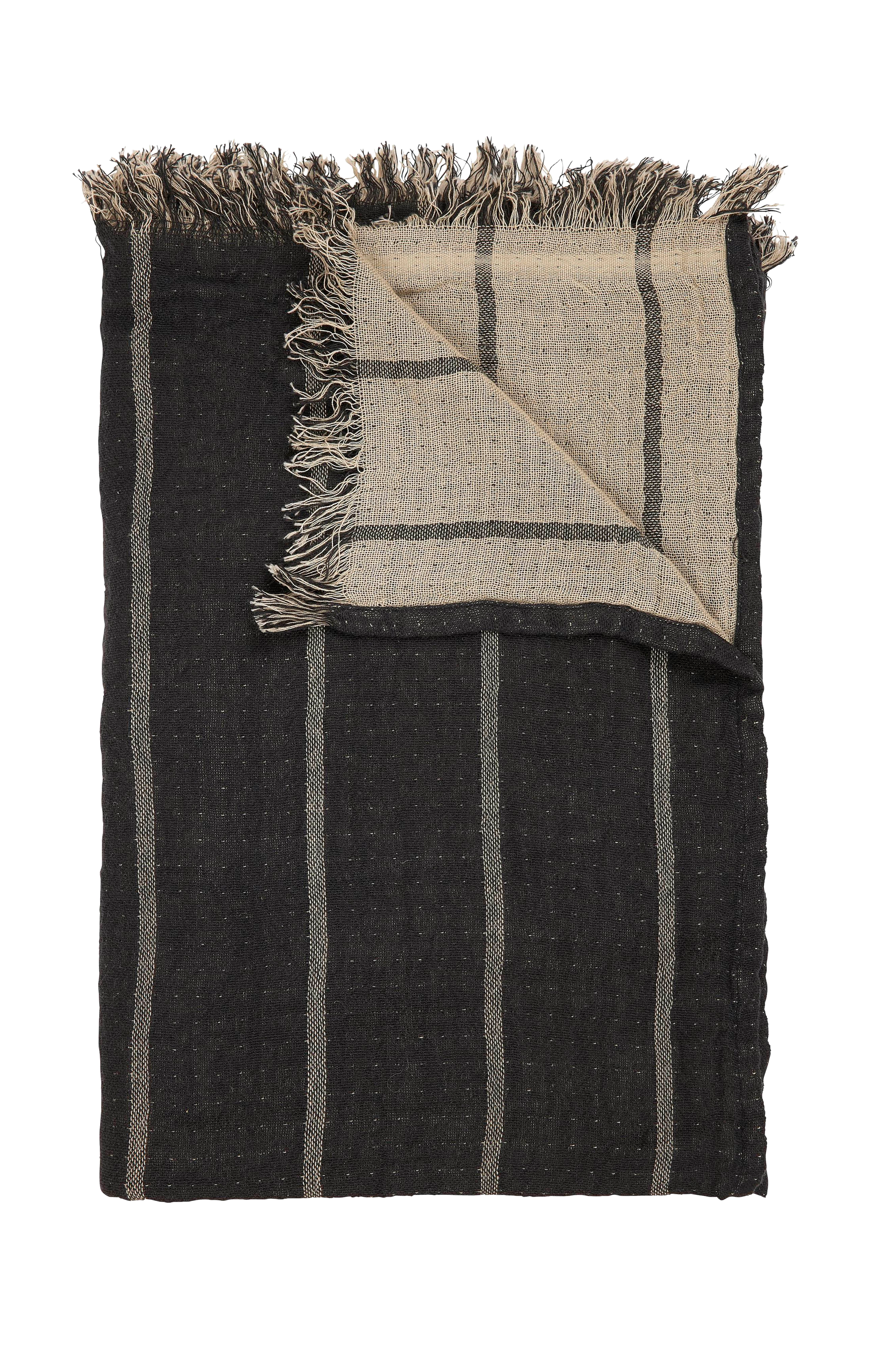 Torekov er et tosidig, svært mykt stripet bomullspledd med frynser. Den ene siden er svart/beige og den andre beige/svart.
