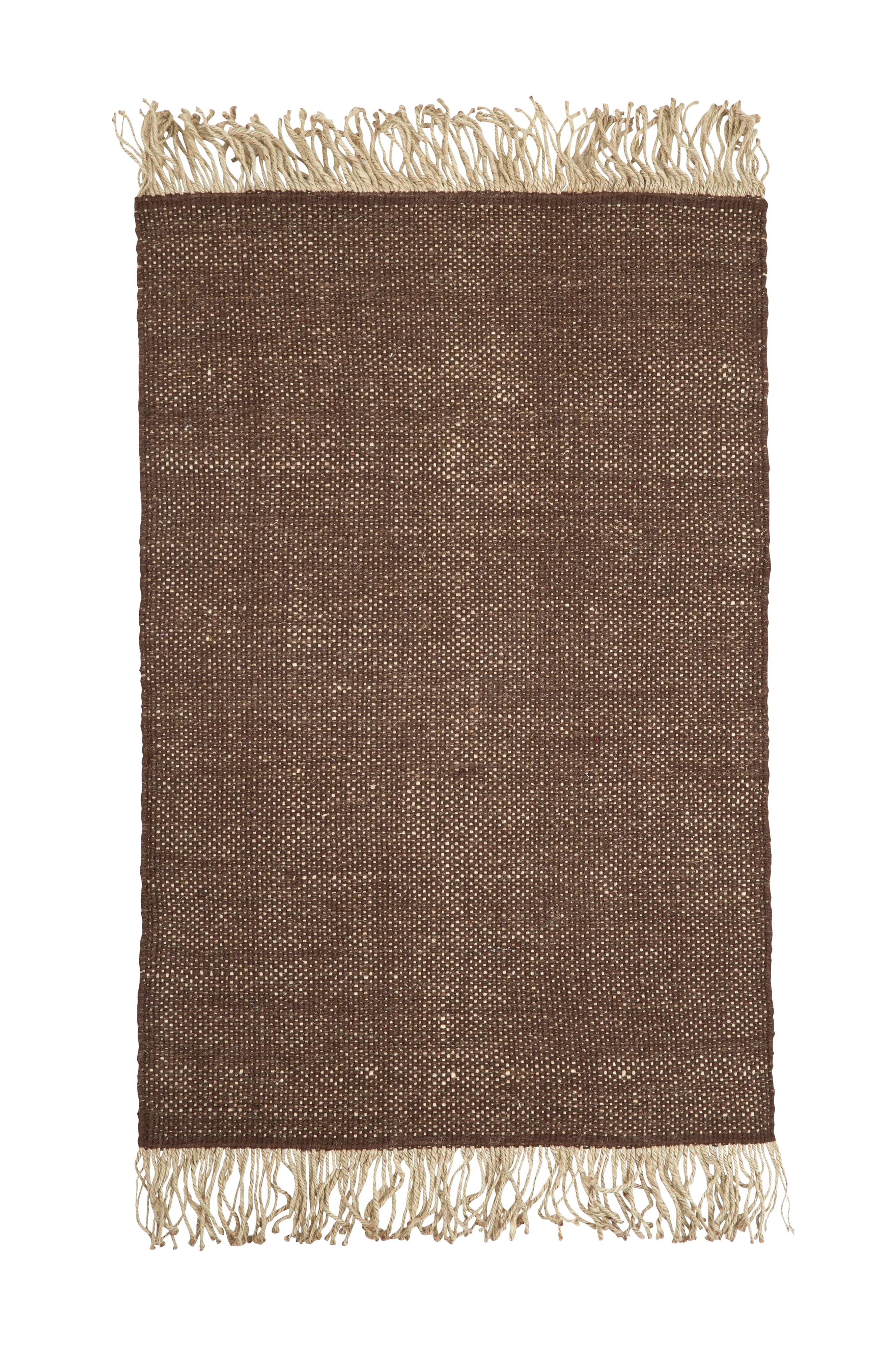 Sandvik er et litt melert teppe med frynser, i en herlig jute-, ull- og bomullsblanding