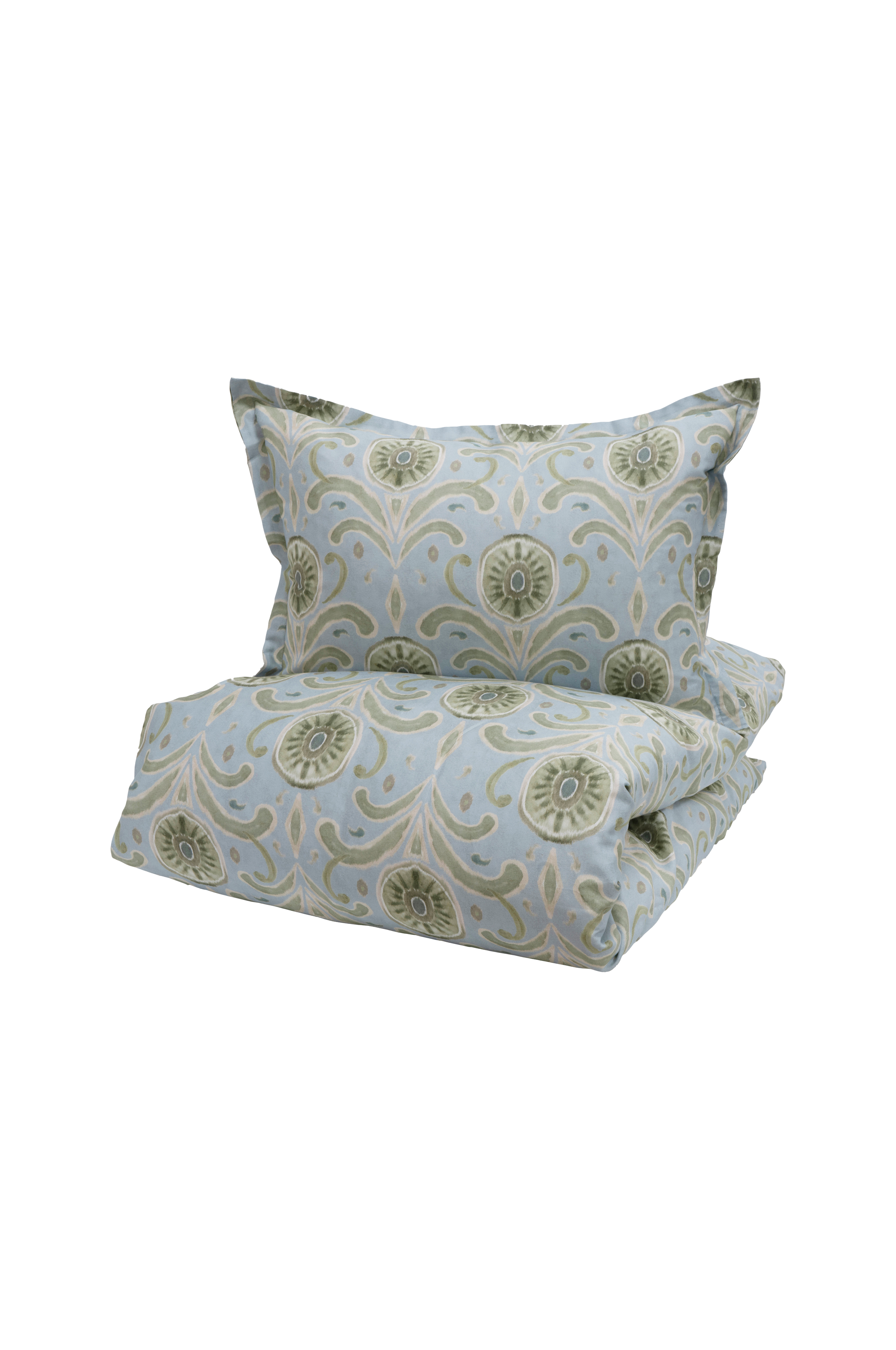 Sengesettet Moulins har en lyseblå bunnfarge med et mønster inspirert av tradisjonell marokkansk design i nyanser av grønt, beige og brunt. Settet er laget av 100 % bomullssatin tc220, og designet ligner malte illustrasjoner som gir et kunstnerisk og eksotisk preg til soverommet ditt. Hvis du er ute etter et kreativt og unikt tilskudd til sengen din, er dette det perfekte valget. Sengesettet er oeko-tex made in green-sertifisert og kommer i 1 vakker farge.størrelsen på sengesettet 140x200, inkluderer 1 dynetrekk og 1 putevar, 50x70 cm. Størrelsen på sengesettet 140x220, inkluderer 1 dynetrekk og 1 putevar, 50x70 cm. Sengesett 200x220, inkluderer 1 dynetrekk og 2 putevar, 50x70 cm.