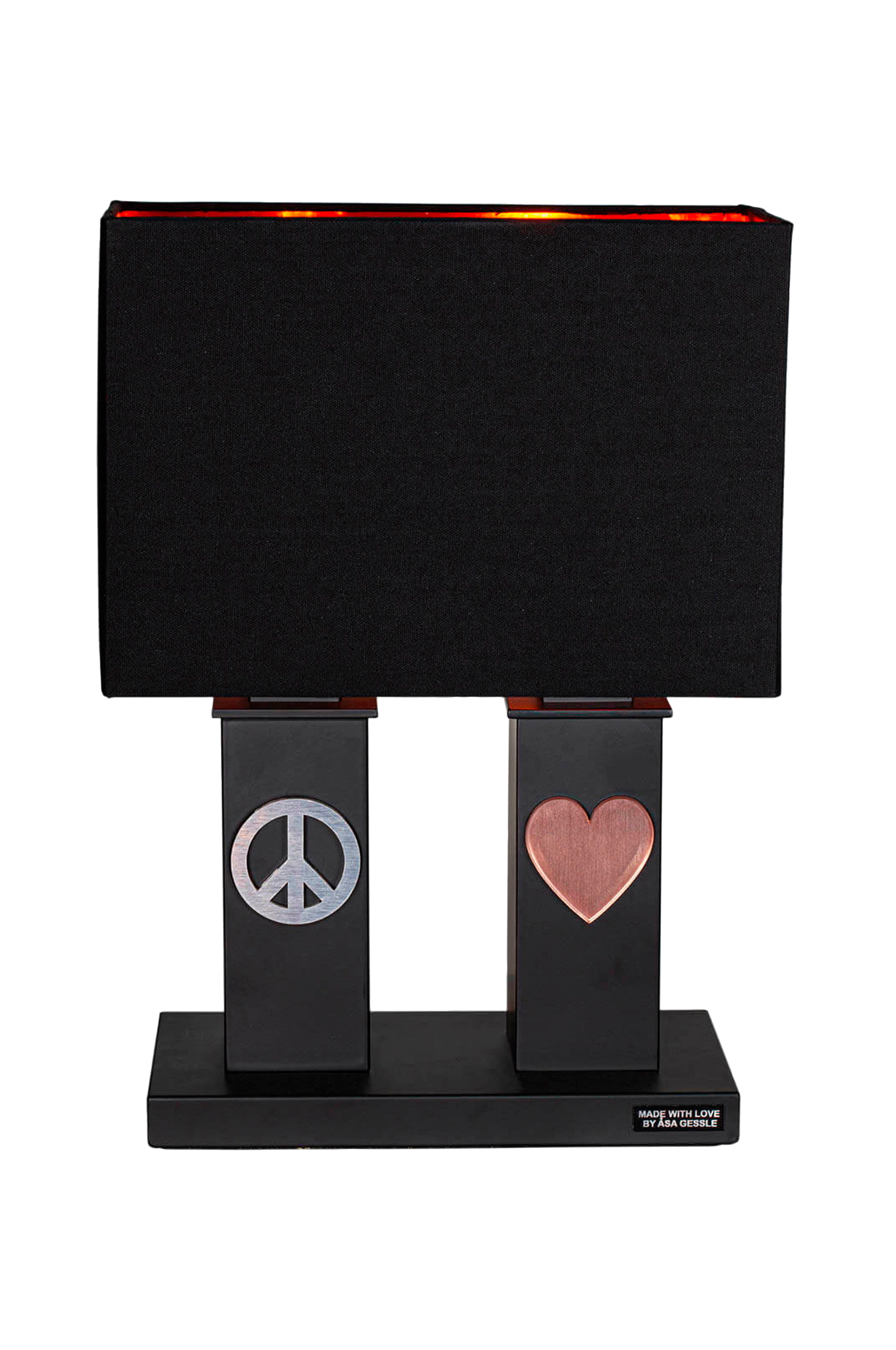Fred og kjærlighet. Stand by me er en stilren bordlampe med rette linjer i matt, svart metall. Den brede, svarte stoffskjermen står i harmonisk kontrast til de smalere søylene på lampefoten, som hver er dekorert med et metallsymbol, bestående av fredstegnet på den ene og et hjerte på den andre. plasser stand by me-bordlampen på ditt favorittsted i hjemmet og nyt den dag etter dag. stand by me-bordlampen er designet av åsa gessle eksklusivt for by rydén og er en av syv ulike modeller i vårt sortiment. stand by me bordlampe måler 36 cm i diameter og er 51 cm høy. stand by me bordlampe krever to lyskilder med e27-sokkel med maks. 5w led. Hvis du bruker riktig lyskilde og har en dimmer installert, er stand by me-bordlampen også dimbar.